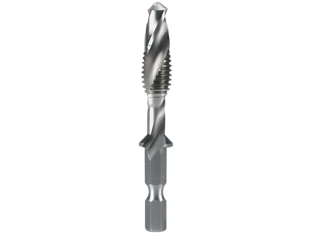 Kombi-tappen med 1/4" skaft (bit) for kerneboring og gevindskæring. Kombi-tappen er ideel til pladebearbejdning med højre- og venstreløbede akkuboremaskiner. Gevindet skæres i en arbejdsgang, uden at skifte værktøj, da spiralboret sidder i forenden på snittappen. Flanke: bagslibning. Skaft: 6,35×27,0 mm. Kombi-tappen med 1/4" skaft (bit) for kerneboring og gevindskæring. Kombi-tappen er ideel til pladebearbejdning med højre- og venstreløbede akkuboremaskiner. Gevindet skæres i en arbejdsgang, uden at skifte værktøj, da spiralboret sidder i forenden på snittappen.