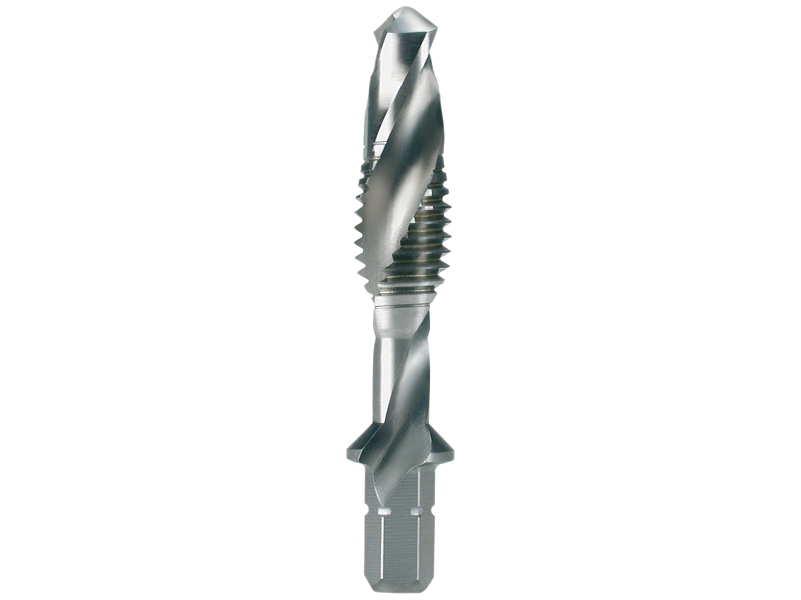 Kombi-tappen med 1/4" skaft (bit) for kerneboring og gevindskæring. Kombi-tappen er ideel til pladebearbejdning med højre- og venstreløbede akkuboremaskiner. Gevindet skæres i en arbejdsgang, uden at skifte værktøj, da spiralboret sidder i forenden på snittappen. Flanke: bagslibning. Skaft: 6,35×27,0 mm. Kombi-tappen med 1/4" skaft (bit) for kerneboring og gevindskæring. Kombi-tappen er ideel til pladebearbejdning med højre- og venstreløbede akkuboremaskiner. Gevindet skæres i en arbejdsgang, uden at skifte værktøj, da spiralboret sidder i forenden på snittappen.