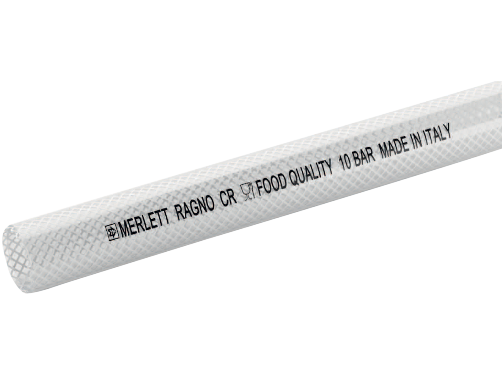 Blød PVC-slange med polyester tekstilarmering. Til transport af kølevæsker og kemiske blandinger i næringsmiddelindustrien. Fødevarekvalitet iht. EU norm 1935/2004.