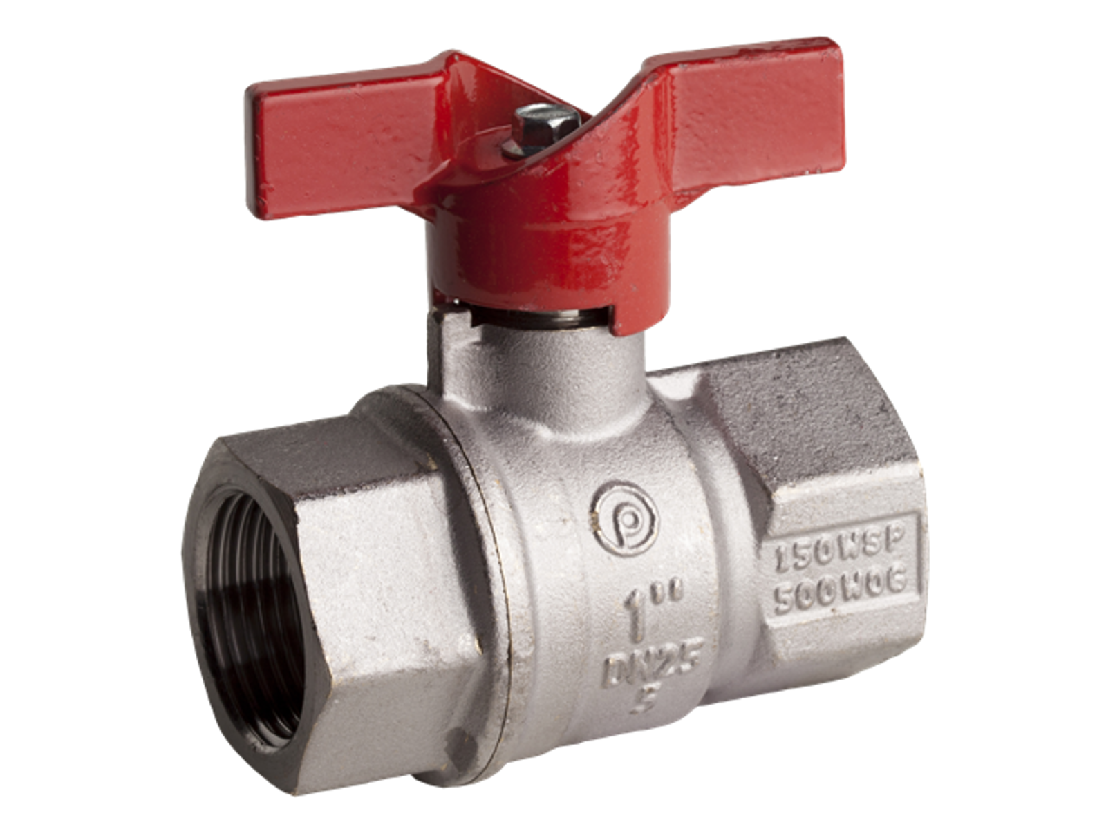 Kraftig kuglehane med fuldt gennemløb. TEA overfladebehandling. Muffe/muffe. Rødt T-greb. 1/2".