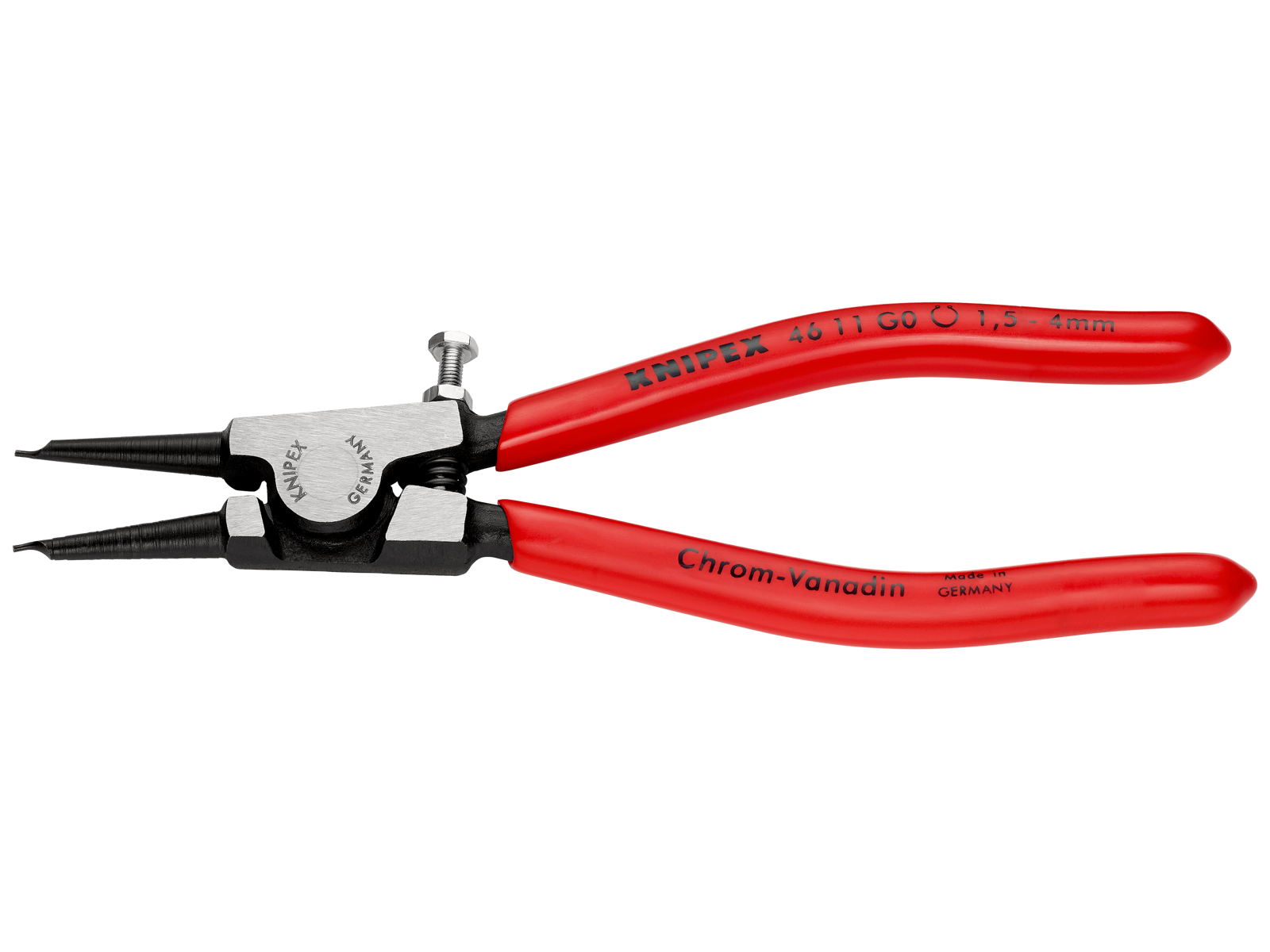 Låseringstang til griberinge ø1,5 - 4,0 mm på aksler. Modellen har åbningsfjeder samt justerbar begrænsningsskrue som beskyttelse mod overudspiling. Robust form, smedet og med skridhæmmende, stabile spidser.