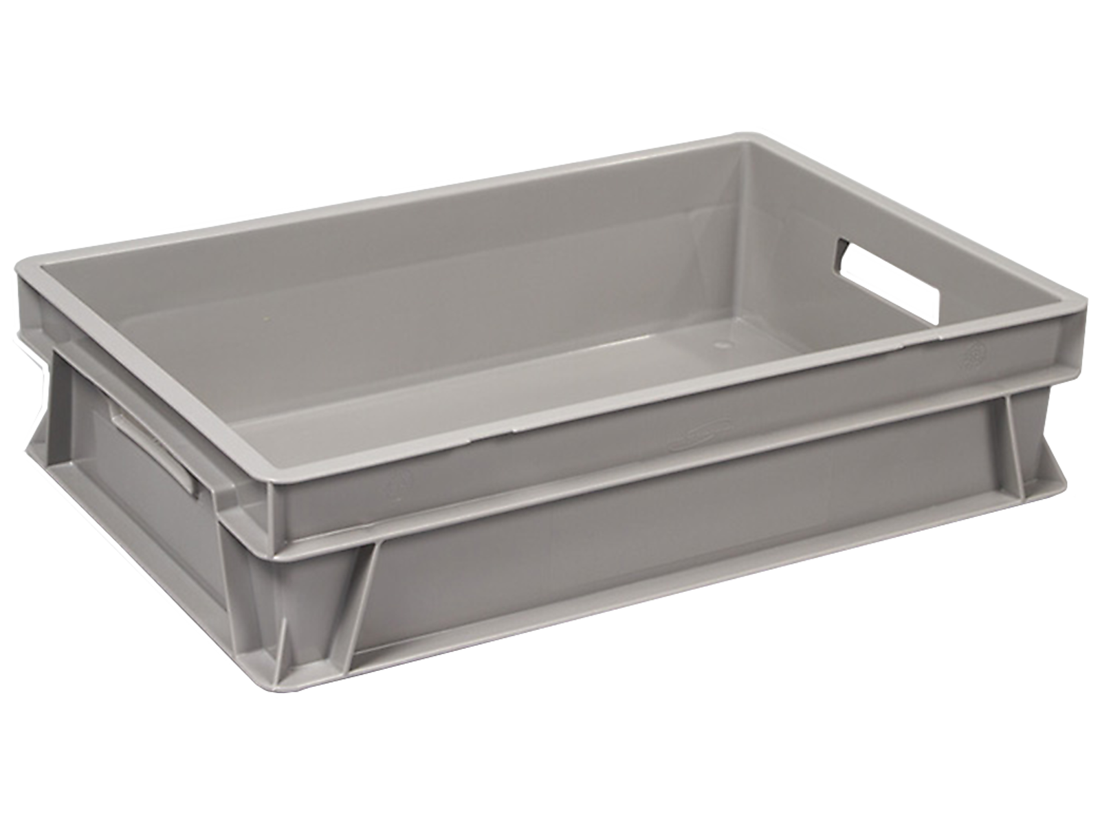 Grå transportkasse tilpasset EU-paller. Rette sider for optimal lagerplads, og lodrette ribber for stabling af styrke op til 1.000 kg. Alle modeller kan stables på hinanden for effektiv og fleksibel transport og opbevaring.