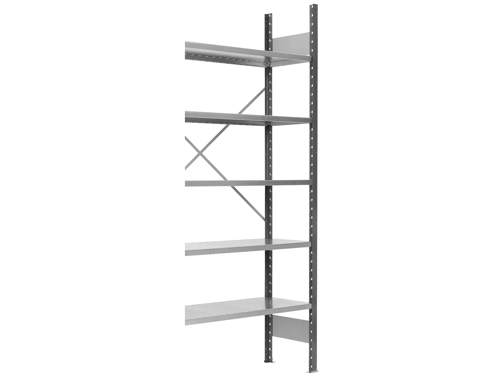 Stållagerreol med åben gavl. Startsektion leveret komplet med 4 stolper med fod, 4 tværplader, 1 rygkryds og 5 galvaniserede hylder med hyldekroge. Følgesektion leveret komplet med 2 stolper med fod, 2 tværplader, 2 rygkryds og 5 galvaniserede hylder med hyldekroge. Reolen er enkel at montere. Leveres i to højder hhv. 2.100 og 2.500 mm samt fire forskellige dybder 300, 400, 500 eller 600 mm. Kapacitet: 135 kg pr. hylde, jævnt fordelt. Opfylder normen SS2241. Et reolsystem der kan opbygges efter egne ønsker og med stort tilbehørsprogram.