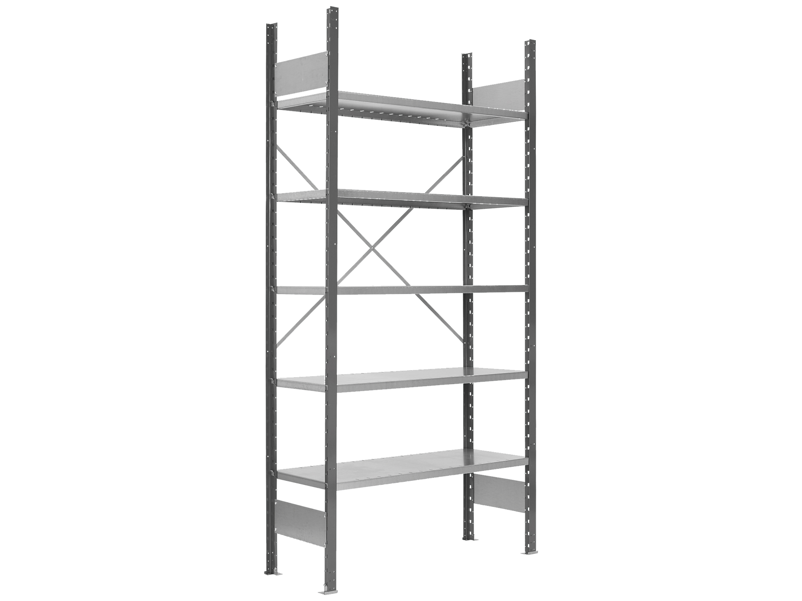 Stållagerreol med åben gavl. Startsektion leveret komplet med 4 stolper med fod, 4 tværplader, 1 rygkryds og 5 galvaniserede hylder med hyldekroge. Følgesektion leveret komplet med 2 stolper med fod, 2 tværplader, 2 rygkryds og 5 galvaniserede hylder med hyldekroge. Reolen er enkel at montere. Leveres i to højder hhv. 2.100 og 2.500 mm samt fire forskellige dybder 300, 400, 500 eller 600 mm. Kapacitet: 135 kg pr. hylde, jævnt fordelt. Opfylder normen SS2241. Et reolsystem der kan opbygges efter egne ønsker og med stort tilbehørsprogram.