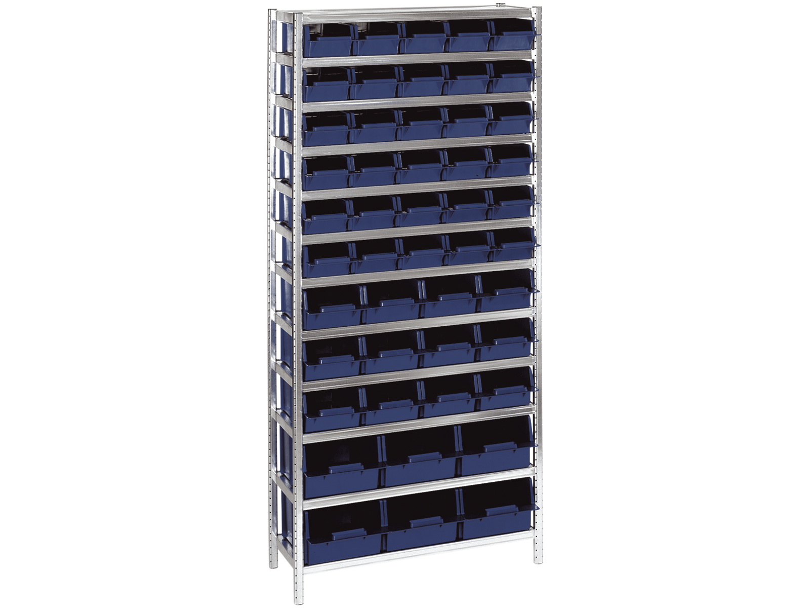 Reol med 48 stk. reolkasser: 30 stk. af typen 5-600, 12 stk. af typen 6-1100 og 6 stk. af typen 8-2000.