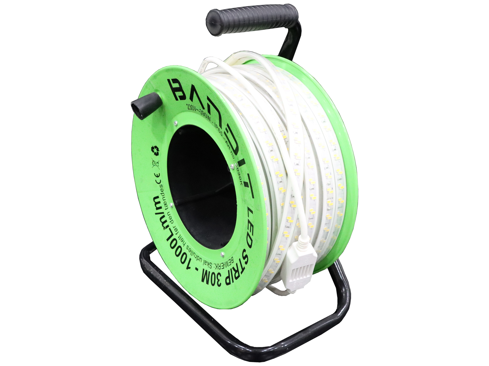 Bandit LED-lysstribe på tromle til hurtig tilsluttet orienteringsbelysning op til 30 mtr. Let at rulle ud og kan afklippes i længder med en mtr. interval. Båndets bredde og tykkelse: 18 mm × 7 mm. Forsynes fra en 230 V driver indbygget i tromlen. Tekniske data: 13 W/mtr., 1.000 Lm/mtr. IP65.