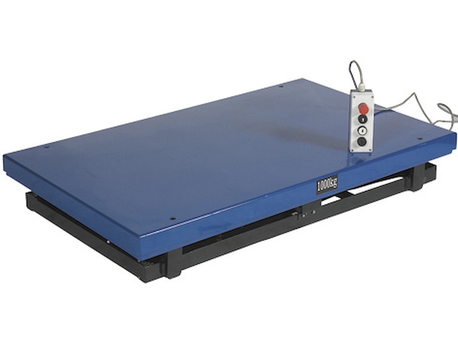 El-hydraulisk løftebord. Kapacitet 1000kg. Løfter materialer til ergonomisk korrekt arbejdshøjde. Fjernbetjent hæve/sænkeenhed med nødstop.