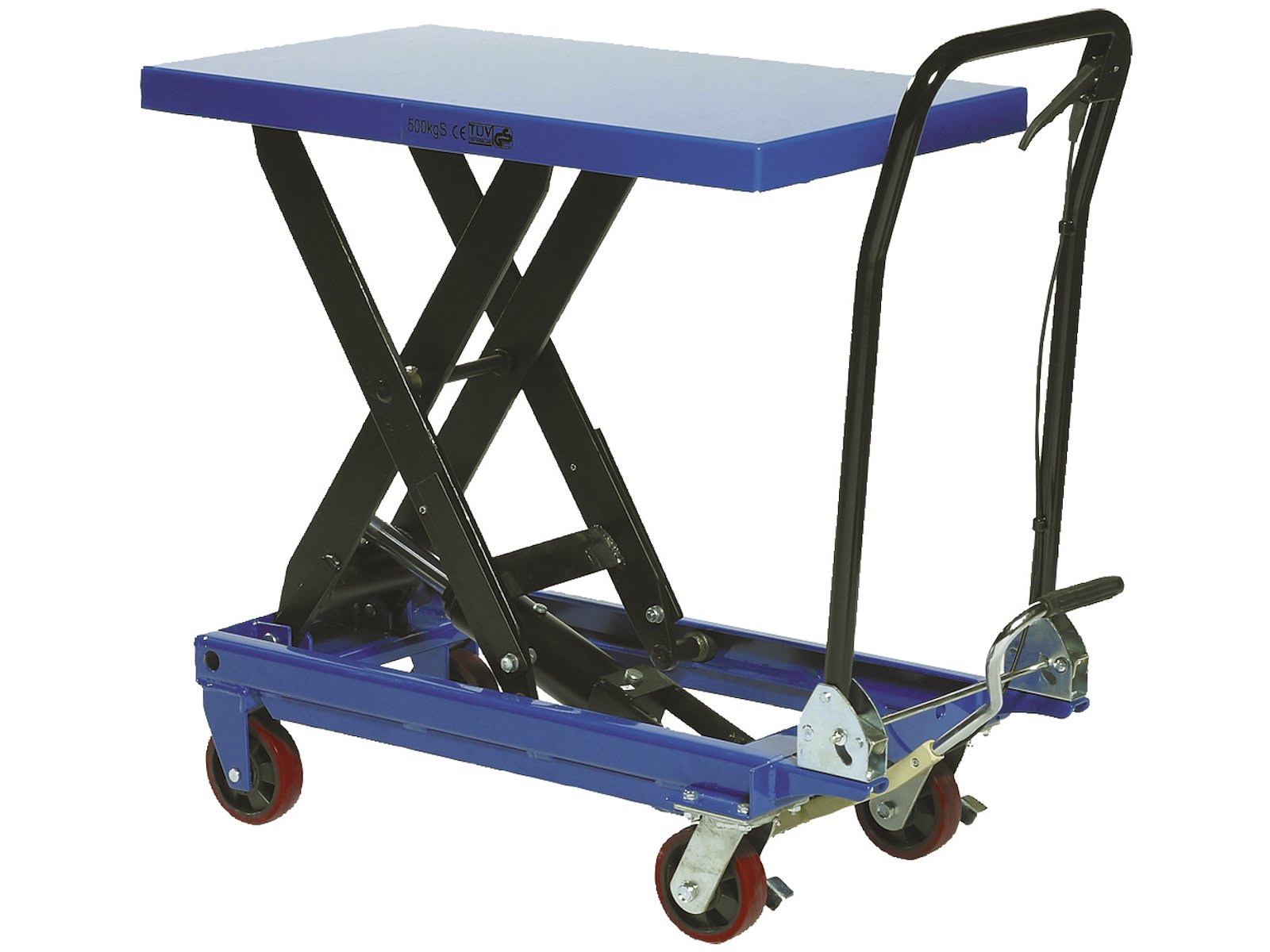 Løftevogn med fodpedal. Giver ergonomisk korrekt arbejdshøjde og løftestilling. Monteret med 2 faste og 2 svingbare hjul med bremse. Løftekapacitet 300kg.