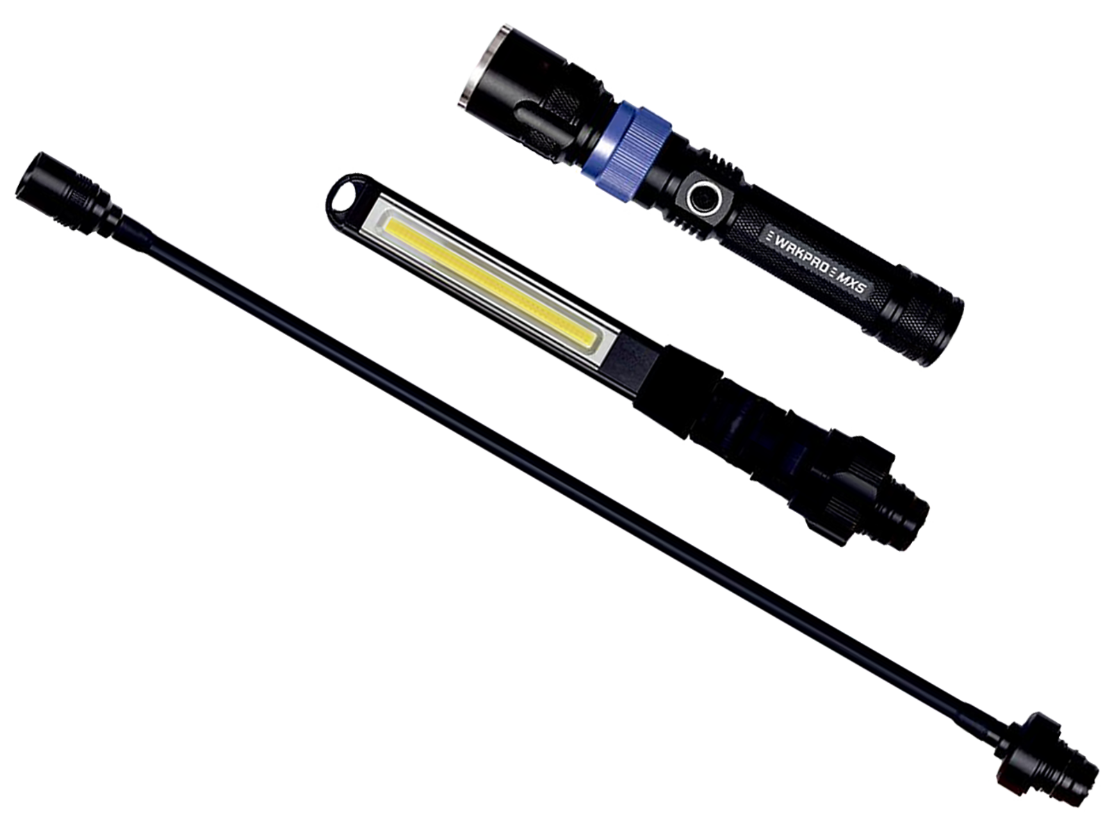 WRKPRO arbejdslampesæt MX5 med 3 forskellige arbejdslys og genopladeligt batteri. 3-i-én arbejdslampe i anodiseret aluminium med magnetisk base og genopladeligt li-ion batteri. Første lampe er Flashlight med CREE LED og fokus funktion. Lampe nr. 2 er en 180° vipbar COB LED arbejdslampe. Sidste lampe er en 360° fleksibel lampe med CREE LED og fokus funktion.