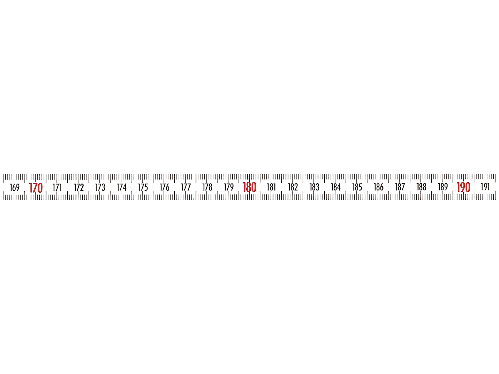 Selvklæbende målebånd i stål med dobbeltsidet klæbebånd. Kontinuerlig gradering venstre mod højre af mm og cm. Sort graduering i top og bund. Løbende cm mærket med sorte tal. Løbende meter mærket med røde tal.