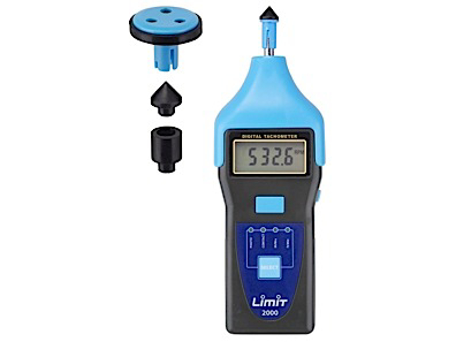 Omdrejningsmåler med digital aflæsning. Kombineret optisk berøringsfri måling og mekanisk registrering med målehjul.