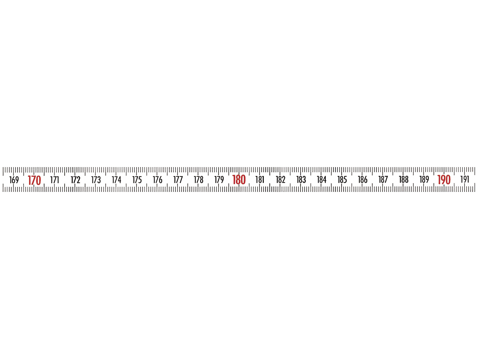 Selvklæbende målebånd i stål med dobbeltsidet klæbebånd. Kontinuerlig gradering af mm og cm. Sort graduering i top og bund. Løbende cm mærket med sorte tal. Løbende meter mærket med røde tal. Båndbredde 13 mm (enkelte varianter 10 mm).