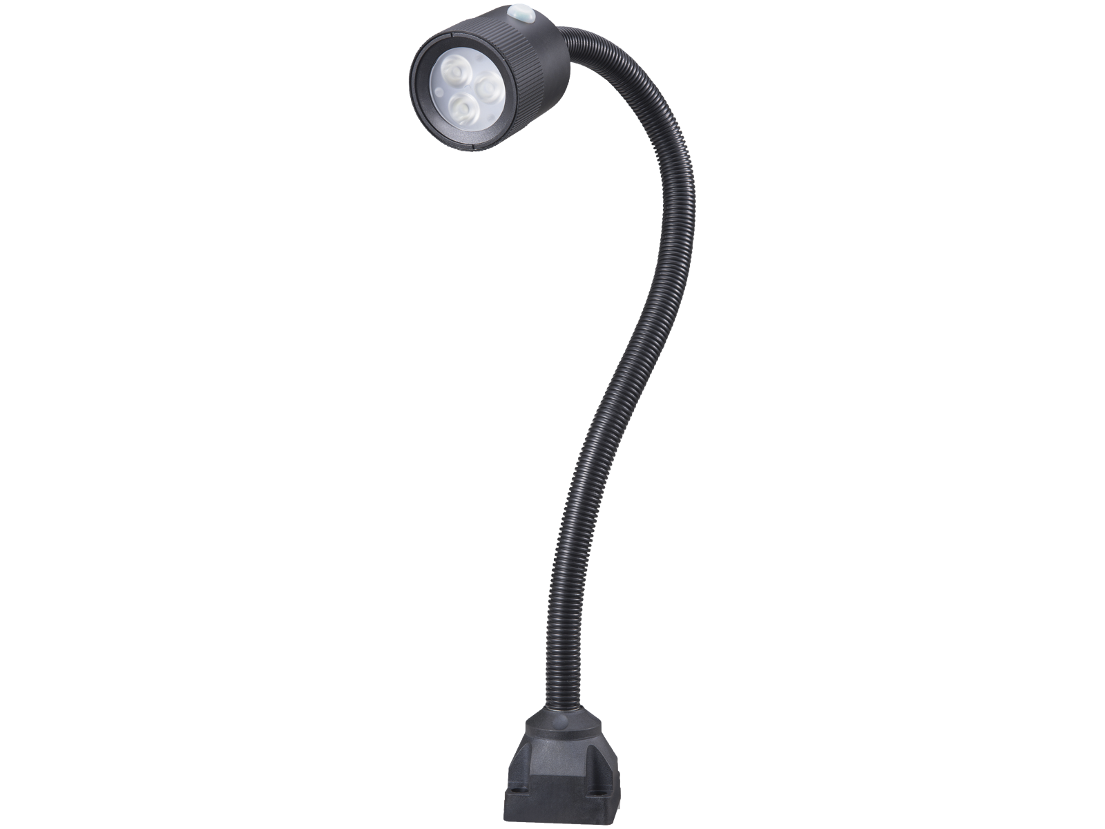 WrkPro Bravo maskinlys med 3 stk. 4,5 W LED-pærer monteret på en 530 mm fleksibel arm, som er beskyttet med plastovertræk. Lampehovedet er af sort, eloxeret aluminium med lang levetid - ca. 50.000 timer - og giver minimal varmeudvikling i lampen. Dette sikrer at lampeglasset ikke misfarves af fastbrændt olie eller lignende. Tænd/sluk-knap på lampehovedet. Bravo yder 320 Lm og giver et naturligt hvidt lys (4.000-4.500 Kelvin). Lysspredning 60°. Tæthedsgrad IP65. Befæstningshuller 4×M6. Hulafstand 47×47 mm. Leveres med 2 mtr. ledning. Findes i to varianter hhv. 24 V (uden stik) og 230 V (med EU-stik).
