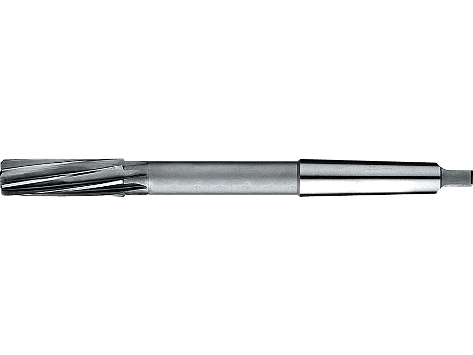 Konisk maskinrival med spiralskær (venstre). Tolerance H7. Anvendes til udvidelse og glatning af huller i metal. Fås i dimensionerne 4-50 mm.