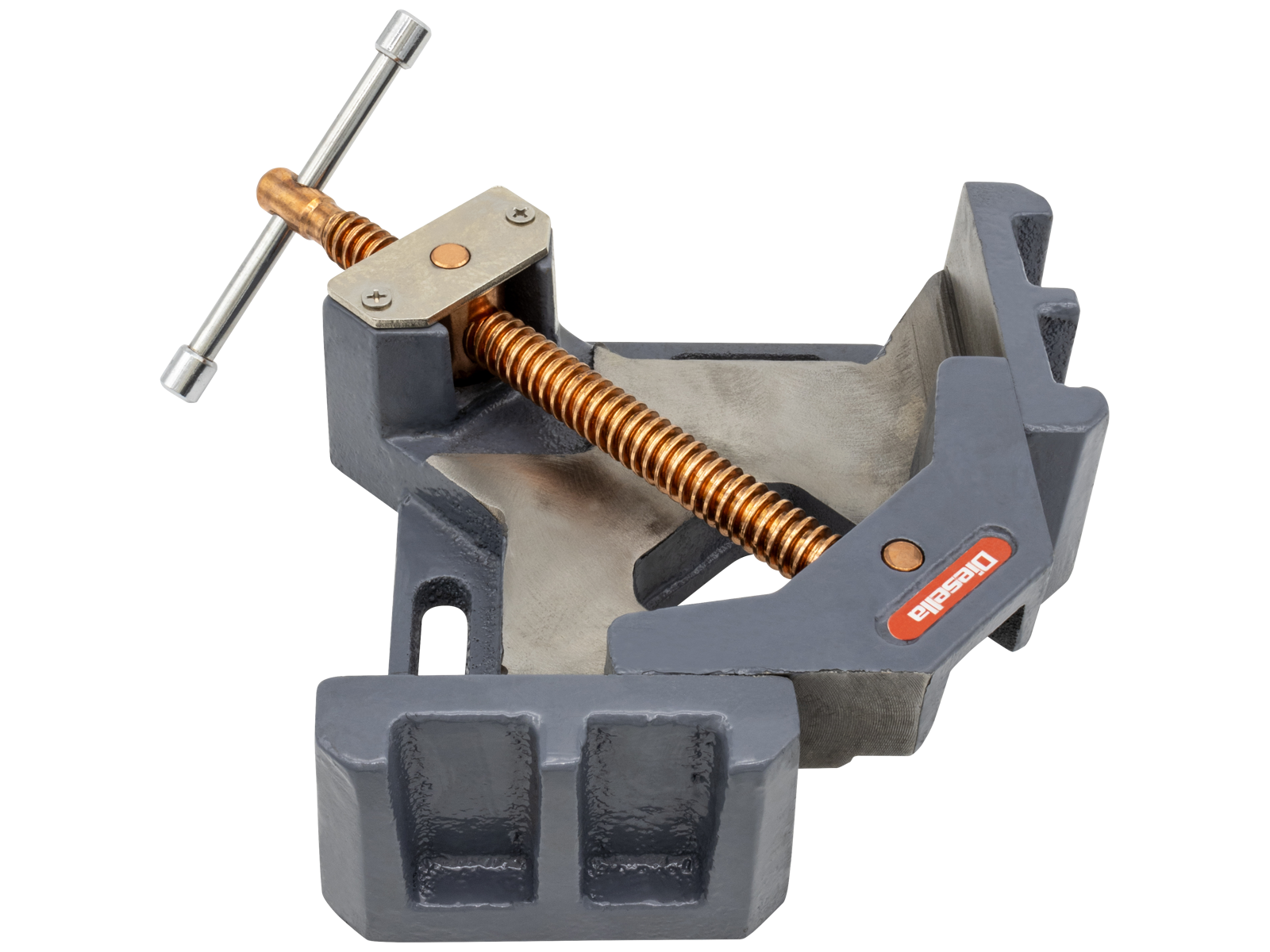 Heavy-duty 90°-vinkelskruestik til fastgørelse af emner vinkelret på hinanden. Skruestikken er særlig velegnet til svejsning af stålprofiler og rør. Spindlens fastgørelse er drejelig og giver dermed mulighed for at spænde forskellige dimensioner på samme tid. Udført i støbejern med kobberbelagt spindel og grundplade med monteringshuller.