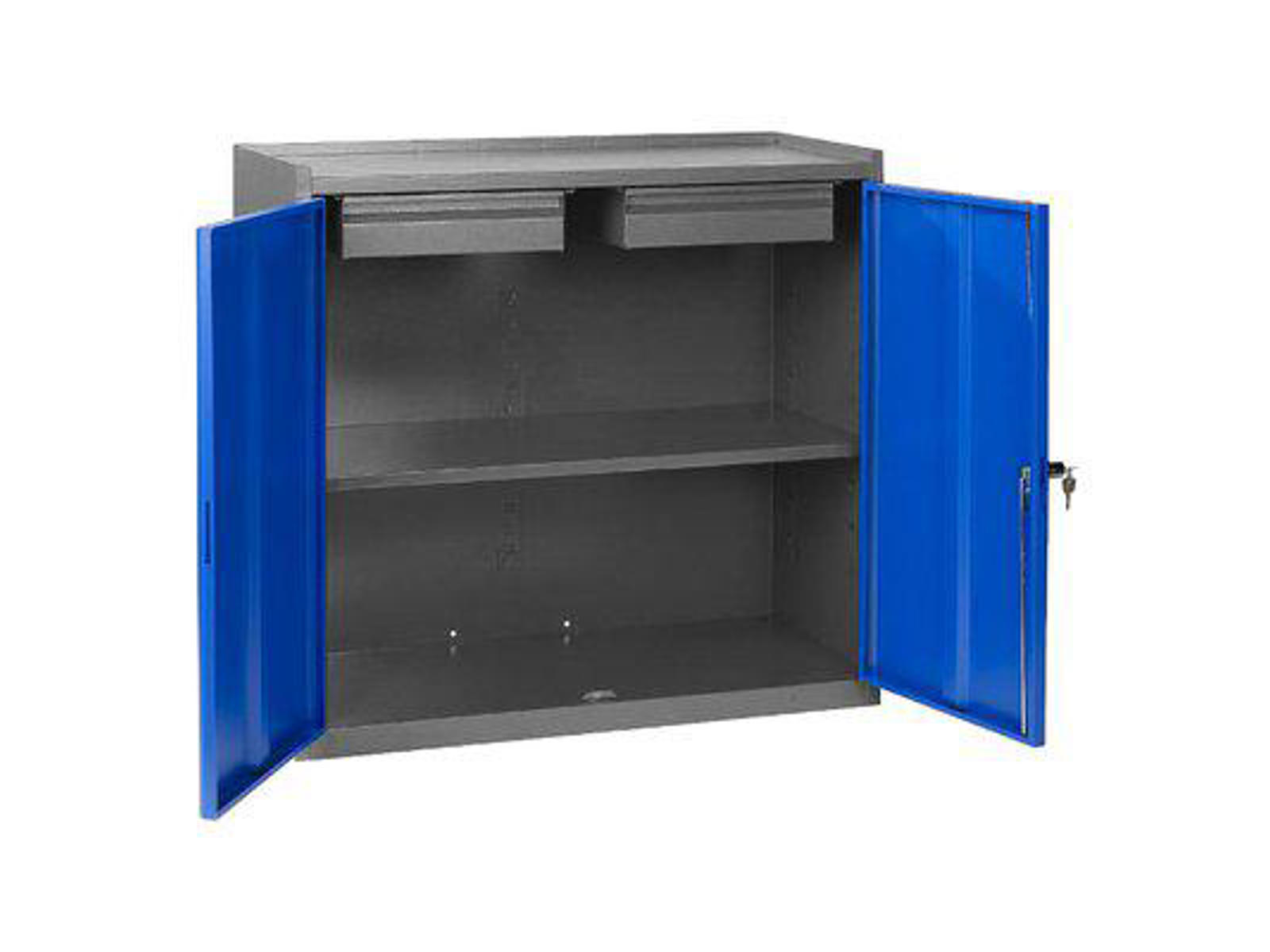 Værkstedsskab af stålplade, i svejst udførelse, med flytbar hylde og lås i lågen, pulverlakeret grå RAL7037, blå RAL 5005, aflastningshylde på oversiden, kan udstyres med gummimåtte, hjul og skrivepult Dobbeltskab inkl 2 låger, 1 hylde der tåler 25kg og 2 skuffer til 20 kg |