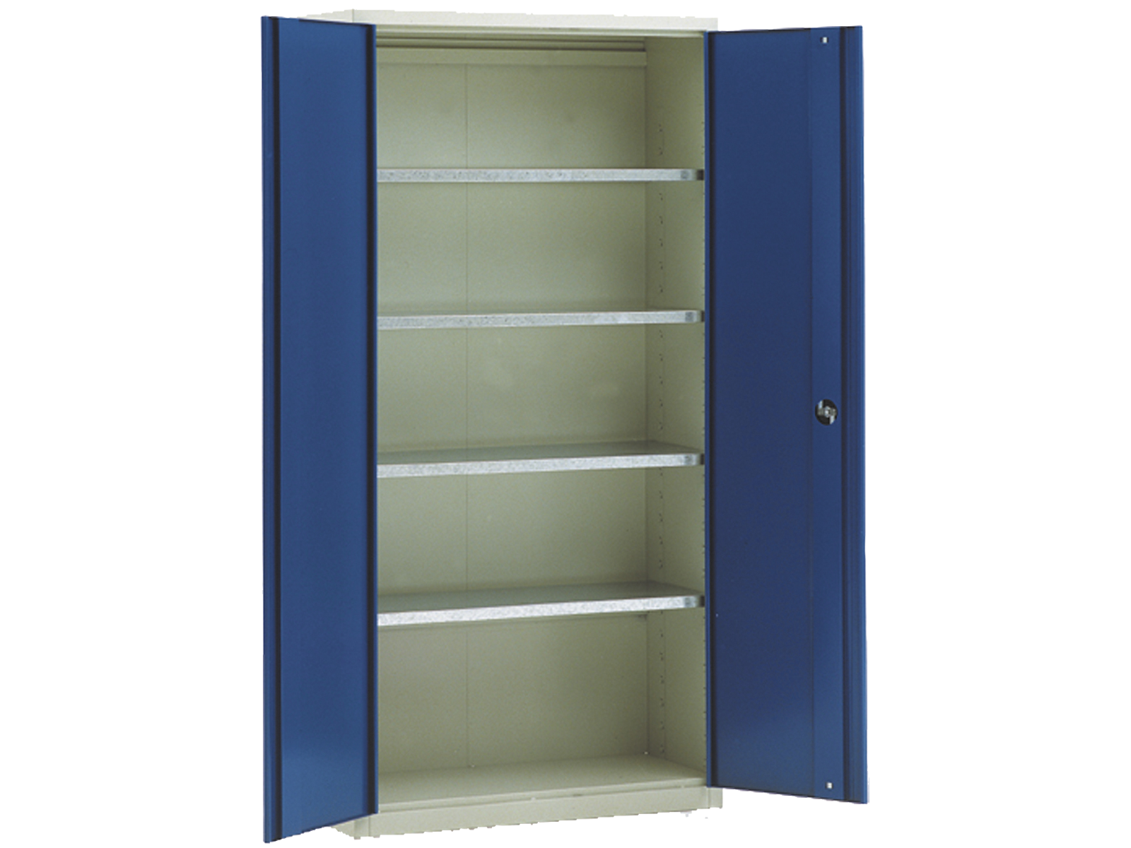 Robust og rummeligt materialeskab med masser af opbevaringsplads. Design med fleksibel indretning, som dækker behovet for opbevaring af værktøj, maskiner, arbejdstøj, dokumenter, bits, søm osv. Låger med udvendige hængsler åbner 180°. Hylderne kan flyttes uden brug af værktøj og har en belastningsevne på op til 60 kg. Fremstillet af fuldsvejst stålplade. Lysningsmål (H×B×D): 1.870×920×425 mm. Udvendige mål (H×B×D): 2.000×1.000×445 mm. Fås i flere varianter.