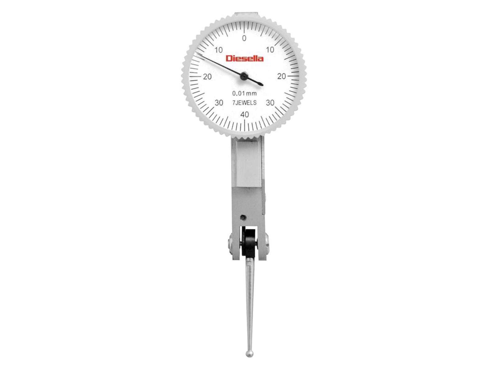 Vippeindikator med standard-urskive (ø32 mm) og vippearm. 0-40-0 mm skala. 0-0,8 mm måleområde. 0,01 mm aflæsning. Opspændingsskaft 4+8 mm inkl. 3 × svalesporet opspænding. DIN 2270 standard. Fås i flere varianter.