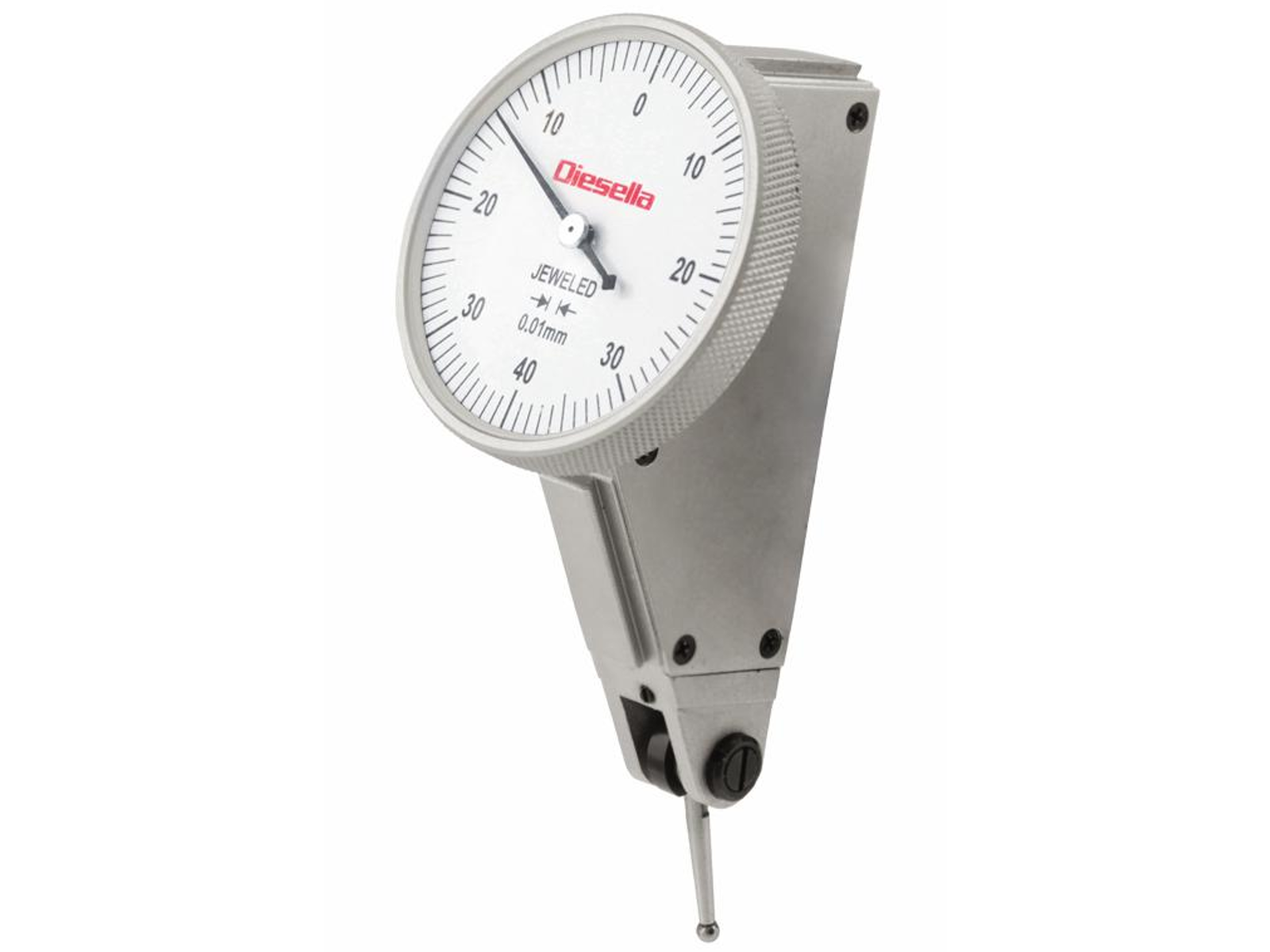 Vippeindikator med hvidt skråstillet måleur (ø32 mm). Aflæsning 0,01 mm. Måleområde 0-0,8 mm. Skala 0-40-0. Vippearm 16 mm (udskiftelig). Leveres i plastkasse.