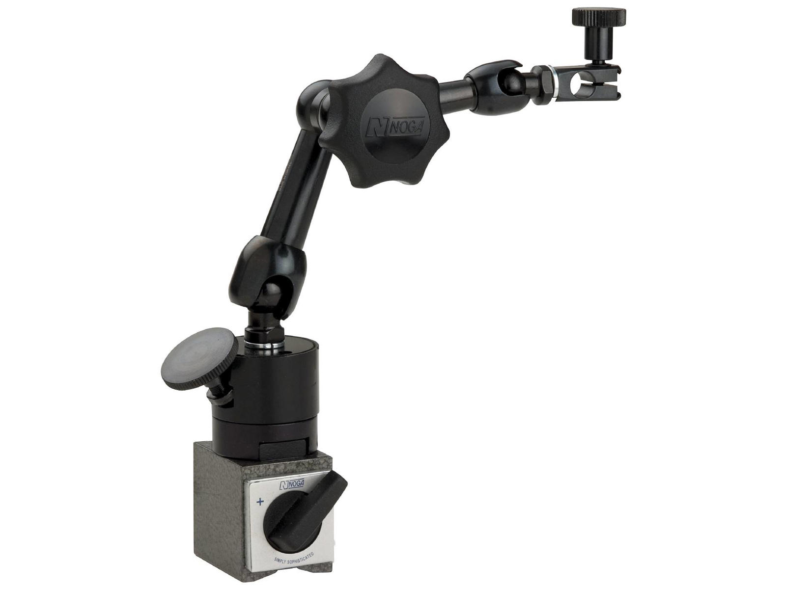 Til vippeindikatorer og normale måleure. Med finjustering og drejelig 360° for fleksibel ansætningsretning. Finjusteringen er placeret på magnetfoden, hvilket giver god tilgængelighed samt bedre stabilitet under finindstillingen. Indikatorstativet er særligt velegnet på snævre og vanskeligt tilgængelige steder. Centrallåsning med et drejegreb til bund-, midter- og topled. Den øvre holder har både hul til måleur og svalehalenot til vippeindikatorur.