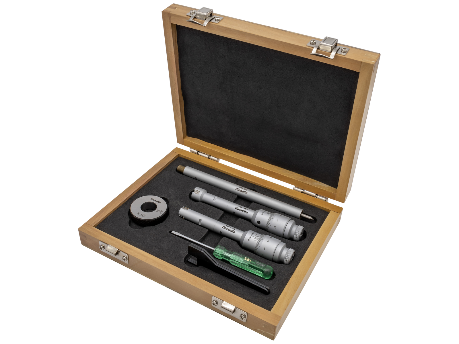 Rustfri mikrometer med matforkromet udførsel for blændfri aflæsning. Måleflader belagt med hårdmetal og måletromlen har tydelig, sort skala og skralde. Kan anvendes til bundhuller. Aflæsning 0,05 mm. Leveres i trækasse inkl. kontrolringe.