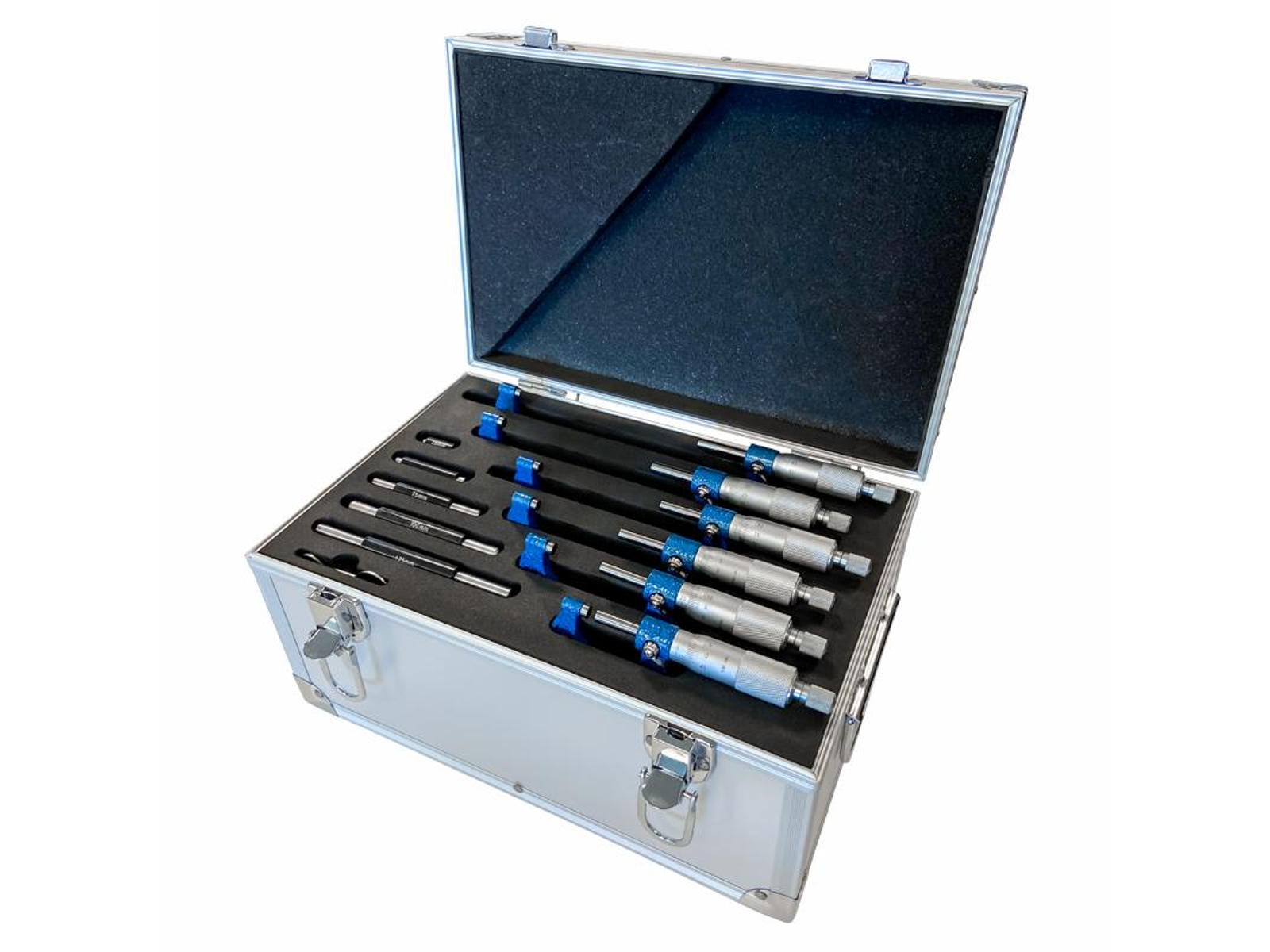 Mikrometerskruesæt med 6 dele. Mikrometerskruer med isoleret bøjle - kontrolmål medfølger fra 25 mm. I matforkromet udførsel med hårdmetal måleflader. DIN 863 standard. Leveres i træboks.