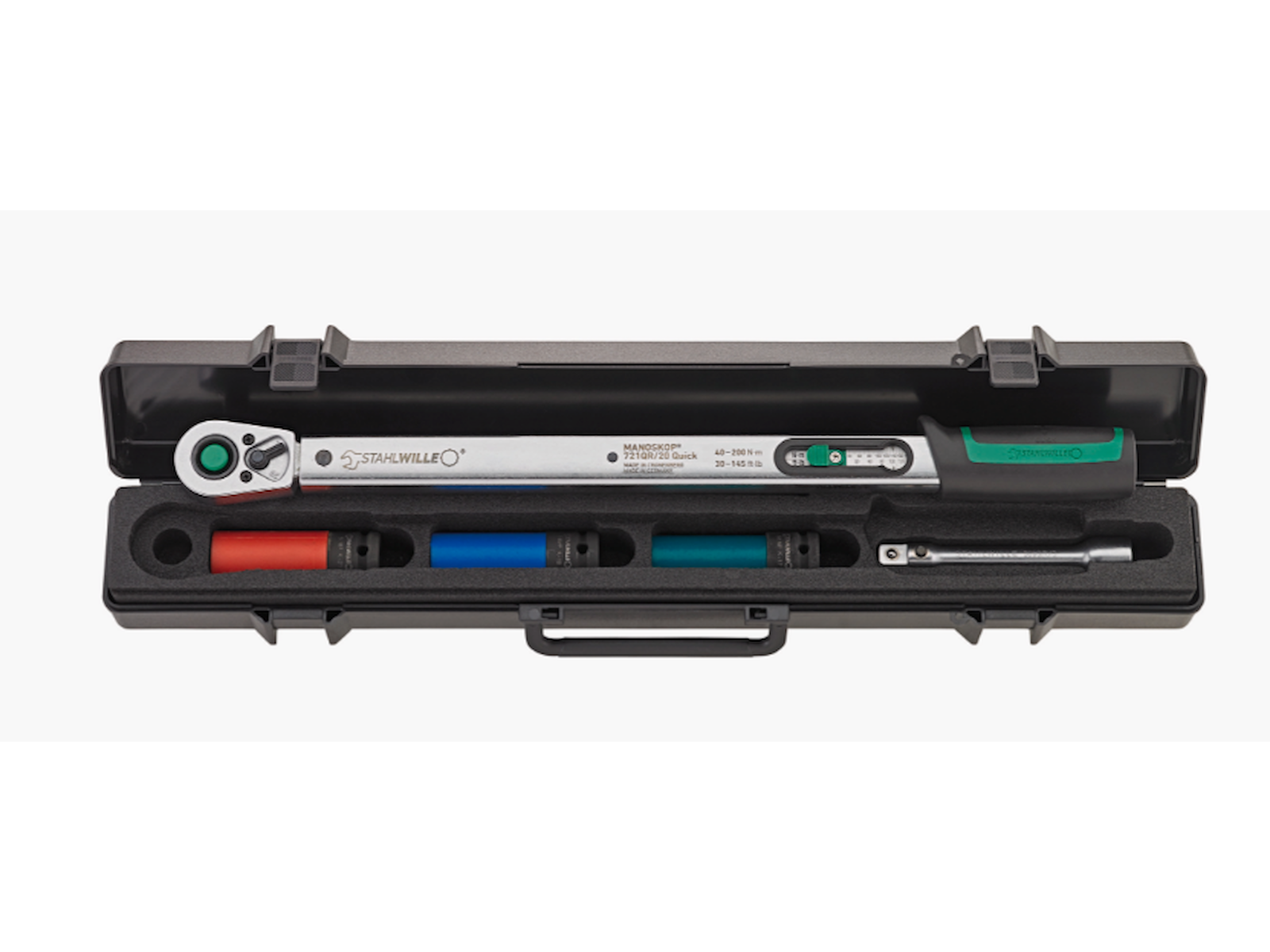Værktøjssæt med fem dele specielt udviklet til hjulskift. Momentnøgle med skralde 1/2" nr. 750NR/200 (SevenFiveZero): taktil med dobbelt stopsignal, 60 tænder, QuickSelect-hurtigjustering, dobbelt skala Nm/ft·lb, maks. målefejl ± 4 %. 3 stk. Impact hjulmøtriktoppe nr. 51IMP K: 17 mm (grøn) 19 mm (blå) 21 mm (rød). 1/2" forlænger (130 mm) nr. 509/5.