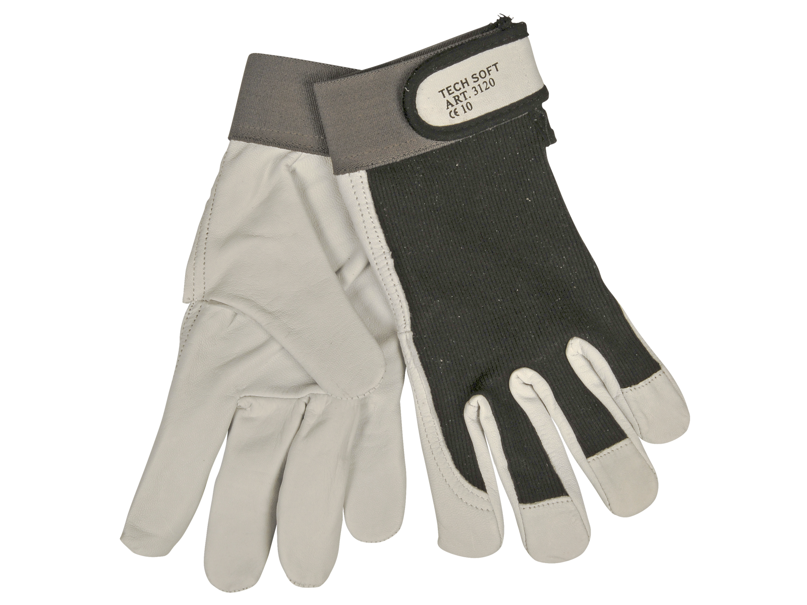 Tech Soft er en tætsiddende arbejdshandske med god fingerføling. Handsken er fremstillet af uforet gedeskind med sort spandex/lycra overhånd og velcrolukning ved håndled. Handsken er slidstærk og til alsidig brug. Kategori II. Godkendelser: EN420 og EN388:2016.