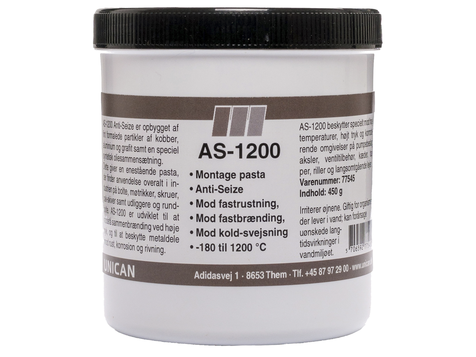 • AS-1200 Montagepasta spray er opbygget af fint formalet partikler af kobber, aluminium, grafit og MoS2 samt en speciel syntetisk oliesammensætning. Dette giver en enestående pasta der finder anvendelse overalt i industrien på bolte, møtrikker og skruer, prespasningssamlinger og pak-skiver samt udliggere og rundbolte. AS-1200 er udviklet til at modstå sammenbrænding ved høje tryk og til at beskytte metaldele imod rust, korrosion og rivning. AS-1200 beskytter specielt mod høje temperaturer, højt tryk og korroderende omgivelser på pumpebeslag, aksler, ventiltilbehør, kæder, tapper, riller og langsomtgående lejer. AS-1200 får dele til at holde længere samt nedsætter slitagen. Dette betyder reducerede udskiftningsomkostninger og lettere reparationsarbejde, selv efter påvirkning af meget høje temperaturer.