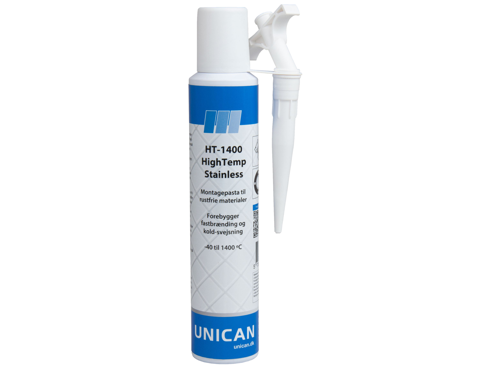 Montagepasta til rustfrie materialer - til forebyggelse af fastbrænding og koldsvejsning. Produktet forholder sig materiale- neutralt ved bearbejdning af højt- legerede stål-typer og andre metal materialer. HT-1400 HighTemp Stainless får dele til at holde længere samt nedsætter slitagen. Dette betyder reducerede udskiftningsomkostninger og lettere reparationsarbejde - selv efter påvirkning af meget høje temperaturer. HT-1400 HighTemp Stainless er fri for svovlholdige tilsætningsstoffer og halogener og kan med fordel benyttes i aggressive miljøer. HT-1400 HighTemp Stainless er opbygget af fint formalet ikke metal holdige partikler samt specialolier. Produktet indeholder ikke metal- pigmenter som f. eks kobber, aluminium, nikkel, bly, zink m.v. Dette giver en enestående pasta der finder anvendelse overalt i industrien på bolte, møtrikker og skruer, prespasnings samlinger og pak-skiver samt udliggere og rundbolte. HT-1400 HighTemp Stainless er udviklet til at modstå sammenbrænding ved høje tryk og til at beskytte metaldele imod rust, korrosion og rivning. Til temperaturer ÷40°C til +1.400°C.
