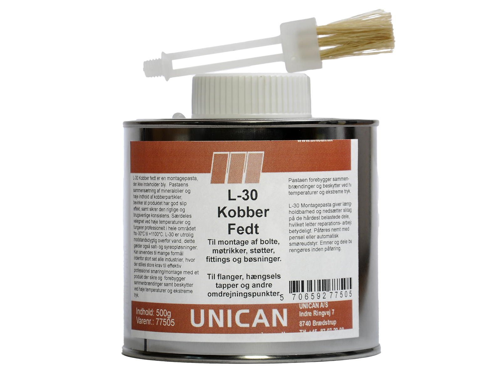 L-30 kobberfedt anvendes til reparations- og montagearbejde alle steder, hvor der samles gevindforbindelser. Produktet forhindrer rivning af gevind ved høje belastninger og virker samtidig fremragende mod fastbrænding i stærkt korrosive miljøer. L-30 løser effektivt montageopgaver i meget ekstreme temperaturområder og klarer uden problemer temperaturer helt op til 1100°C. Ved montageopgaver sprayes L-30 på bolt og møtrik, derefter kan møtrikken spændes uden risiko for rivning, samtidig virker L-30 som en formidabel beskyttelse og forhindrer møtrikken i at rive gevind og senere mod at ruste fast. Dette gør naturligvis reparations- og montagearbejde noget lettere, da man undgår fastlåste samlinger. Den specielle sammensætning af højtryksolier og fine kobberpartikler giver L-30 kobberfedt nogle fremragende kvaliteter, der gør den enestående i smøresituationer med høje belastninger og temperaturer. L-30 kobberfedt kan anvendes indenfor et temperaturområde fra -30°C til +1100°C.