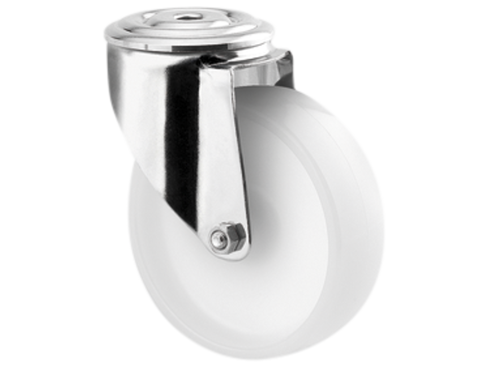 Drejeligt transporthjul i rustfri med bred gaffel og nittet dobbelt kuglekrans. Hvid polyamid med glideleje uden trådfang. Med centerhul- eller pladebefæstigelse. Fås i flere dimensioner.