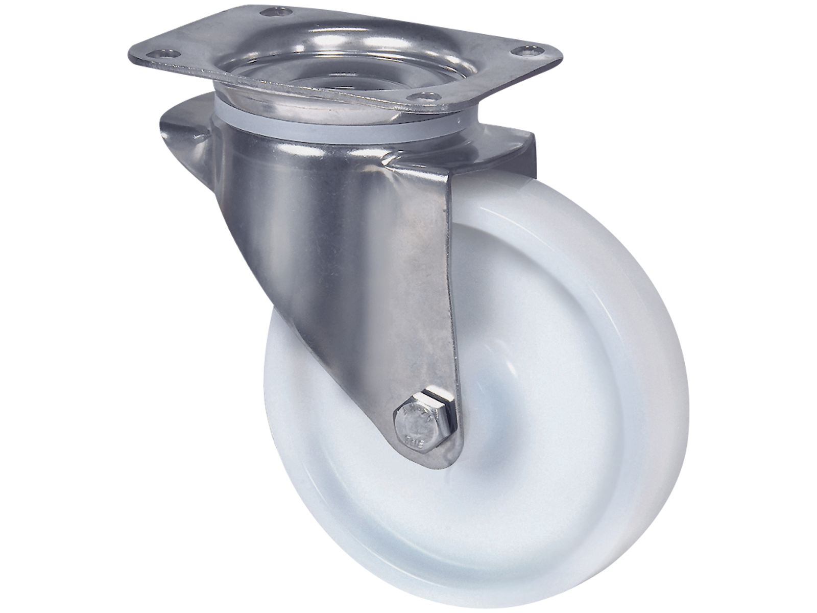 Drejeligt transporthjul i rustfri med bred gaffel og nittet dobbelt kuglekrans. Hvid polyamid med glideleje uden trådfang. Med centerhul- eller pladebefæstigelse. Fås i flere dimensioner.
