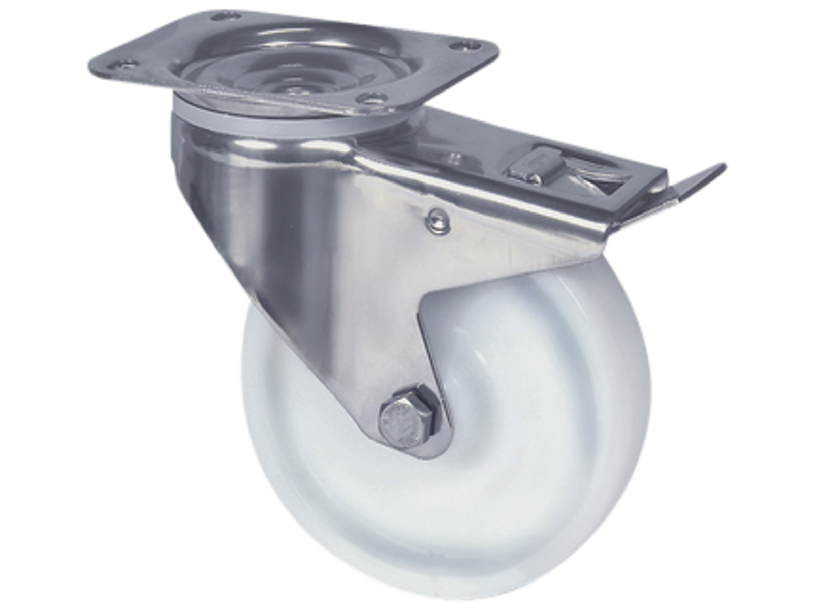 Drejeligt transporthjul i rustfri med totalbremse, bred gaffel og nittet dobbelt kuglekrans. Nav i polyamide med glideleje uden trådfang. Med centerhul- eller pladebefæstigelse. Fås i flere dimensioner.