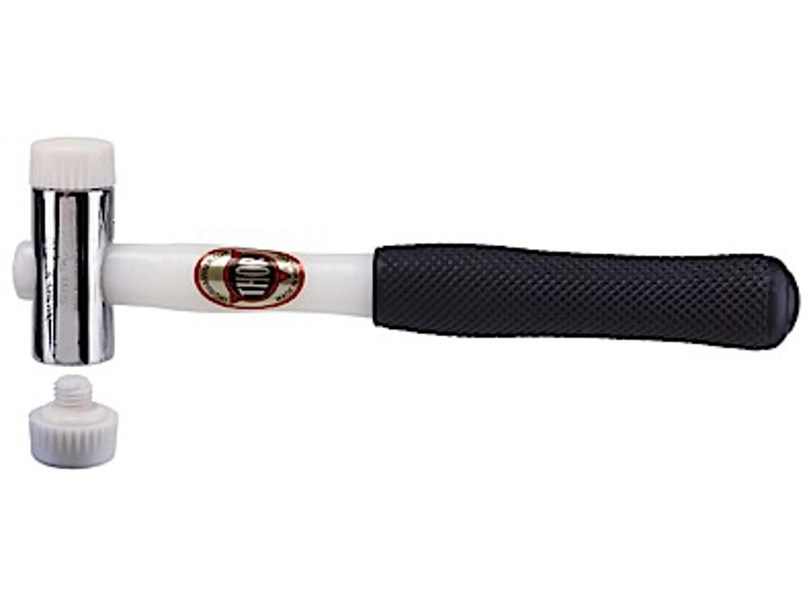 Thorex Nylonhammer, med udskiftelige hvide nylonbaner. (Banerne har gevindtap.) Med nylonskaft og gummihåndtag.
