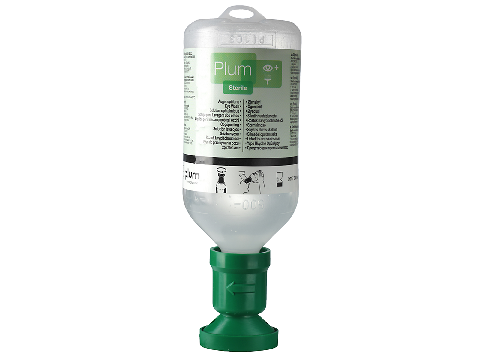 Øjenskyller med øjenkop og støvhætte. Indeholder 0,9 % steril natriumklorid. Fås i tre forskellige størrelser: 200 ml, 500 ml og 1.000 ml med skylletid hhv. 2, 5 og 10 minutter pr. flaske. Uåbnet holdbarhed 3 år. Passer til Plum øjenskyllestationer.