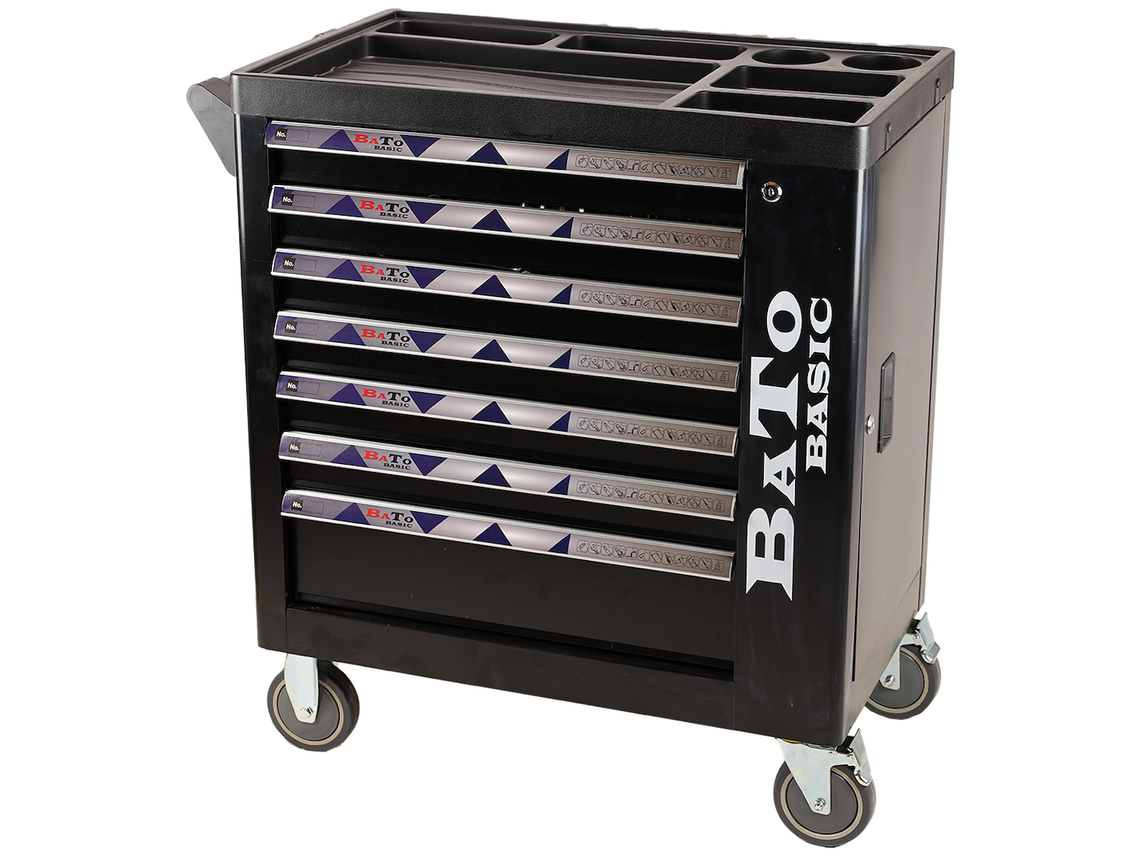 Basic værktøjsvogn med 217 værktøjsdele. Vognen er indrettet med 7 skuffer og 1 endeskab. Derudover er der fire drejelige hjul hvoraf to er med bremse. Indhold: Skuffe 1: 1/4" korttoppe 4-14 mm og langtoppe 4-13 mm, 3/8" korttoppe 10-19 mm, 1/2" korttoppe 10-32 mm og langtoppe 8-22 mm, 1/4" sekskantbits H3-H10, 1/4" Torxbits T15-T50, kardanled 1/4-3/8-1/2", forlænger 1/4", 3/8", 1/2", 72 tands skraldenøgle 1/4", 3/8", 1/2". Skuffe 2: 1/2" lang-kraftoppe 10-24 mm, 1/2" kraftforlænger 125 mm, kraft-kardanled, ringgaffelnøglesæt 6-24 mm. Skuffe 3: hammer 300 g, dornsæt 1,5-6 mm, vandpumpetang 175 mm og 245 mm, stiftnøglesæt 1,5-10 mm, kombitang, spidstang lige, spidstang buet, sideafbider. Skuffe 4: slagskruetrækkere ligekærv 4/5/6/8 mm og PH1/2/3, skruetrækker ligekærv 3 mm, slim-skruetrækker ligekærv 2,5 mm og PH0, Torx-skruetrækkere T9/10/15/20/25/27/30/40, bitsskruetrækker, bitssæt 49 dele 25 mm, bitssæt 7 dele 65 mm, Quick-release bitholder.