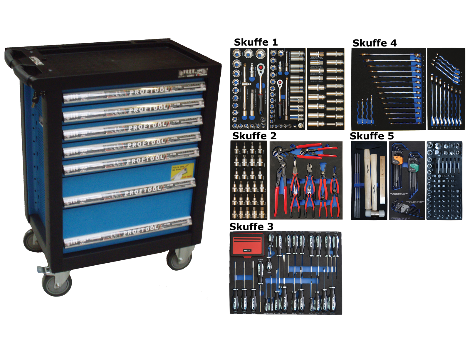 Værktøjsvogn med hjul og syv skuffer med i alt 404 værktøjsdele i EVA-skumindlæg. 1/2" topnøglesæt: 6kt toppe kort 10 - 11 - 12 - 13 - 14 - 15 - 16 - 17 - 18 - 19 - 21 - 22 - 24 - 27 - 30 - 32 - 34 - 36 mm, forlænger 1/2"×125 mm - 1/2"×250 mm, T-grebs adapter, 1/2" kardanled og 1/2" skraldenøgle. 1/4" topnøglesæt: 6kt toppe kort 4 - 4,5 - 5 - 5,5 - 6 - 7 - 8 - 9 - 10 - 11 - 12 - 13 - 14 mm, toppe lang 6 - 7 - 8 - 9 - 10 - 11 - 12 - 13 - 14 mm, stifttoppe 6kt 3 - 4 - 5 - 6 - 7 - 8 mm, Torx 10 - 15 - 20 - 25 - 30 - 40, PZ1 - PZ2, PH1 - PH2, kærv 5,5 mm, forlænger 1/4"×50 mm - 1/4"×100 mm, T-grebsglider, 1/4" kardanled, 1/4" tophåndtag og 1/4" skraldenøgle. 1/2" topsæt: 6kt toppe lang 10 - 11 - 12 - 13 - 14 - 15 - 16 - 17 - 18 - 19 - 20 - 21 - 22 - 23 - 24 mm, tændrørstoppe 1/2" 16 - 18 - 21 mm og 3/8" 14 mm. 1/2" stifttopsæt: 6kt kort 5 - 6 - 7 - 8 - 9 - 10 - 12 - 14 - 17 - 19 mm, Torx kort 20 - 25 - 27 - 30 - 40 - 45 - 50 - 55 - 60, XZN kort M5 - M6 - M8 - M10 - M12 - M14 - M16 - M18. T