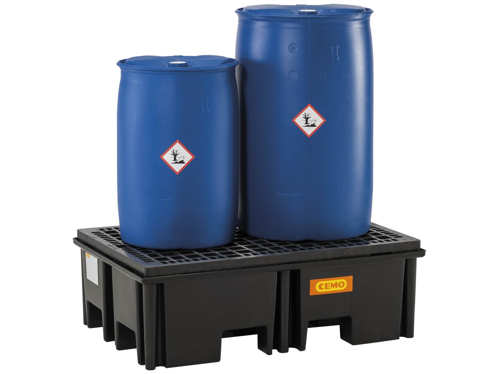 Cemo opsamlingskar designet til to tromler/tønder. Plastgitteret er let aftageligt, så det er nemt at gøre karet rent. Karet er i sin udformning desuden tilpasset, at en gaffeltruck kan komme inde under og løfte det.