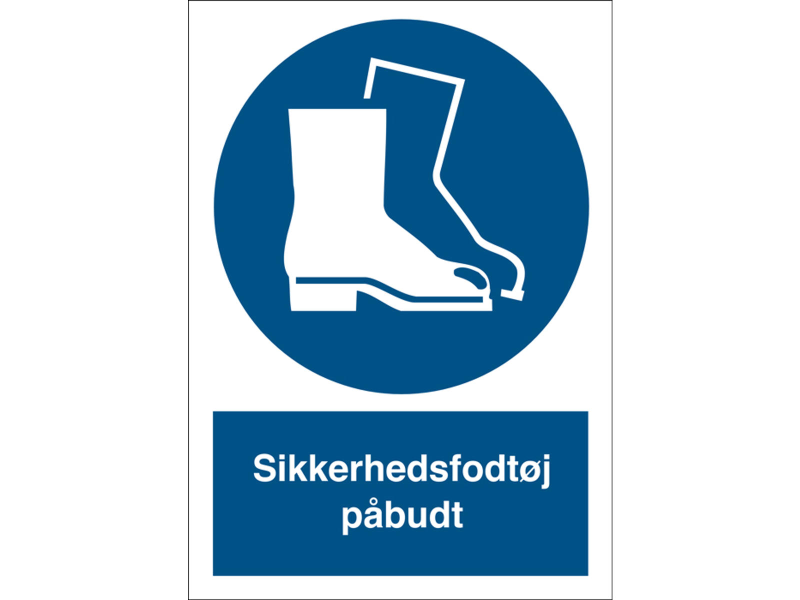 Påbudsskilt "Sikkerhedsfodtøj påbudt" med piktogram og tekst. Plastplade 210×297 mm til opskruning.