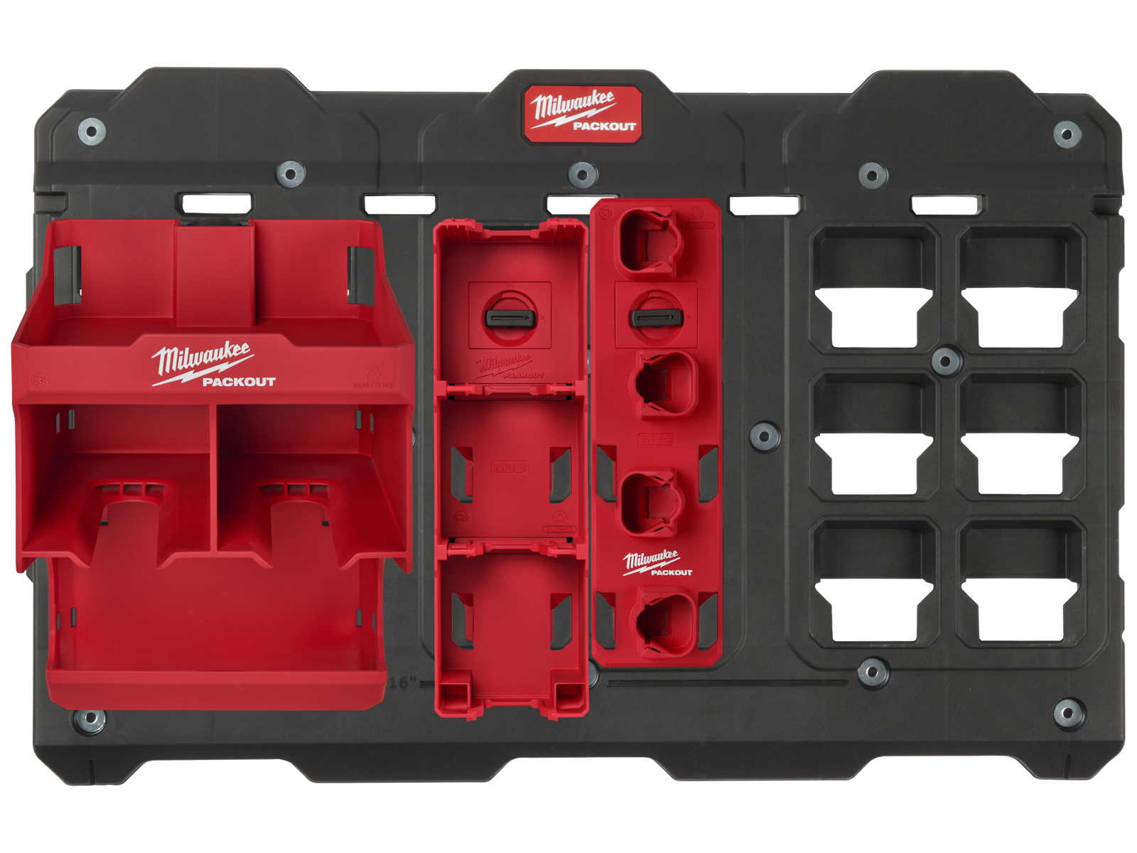 Packout XL monteringsplade og ophæng til elværktøj, M18 batteriholder samt M12 batteriholder.