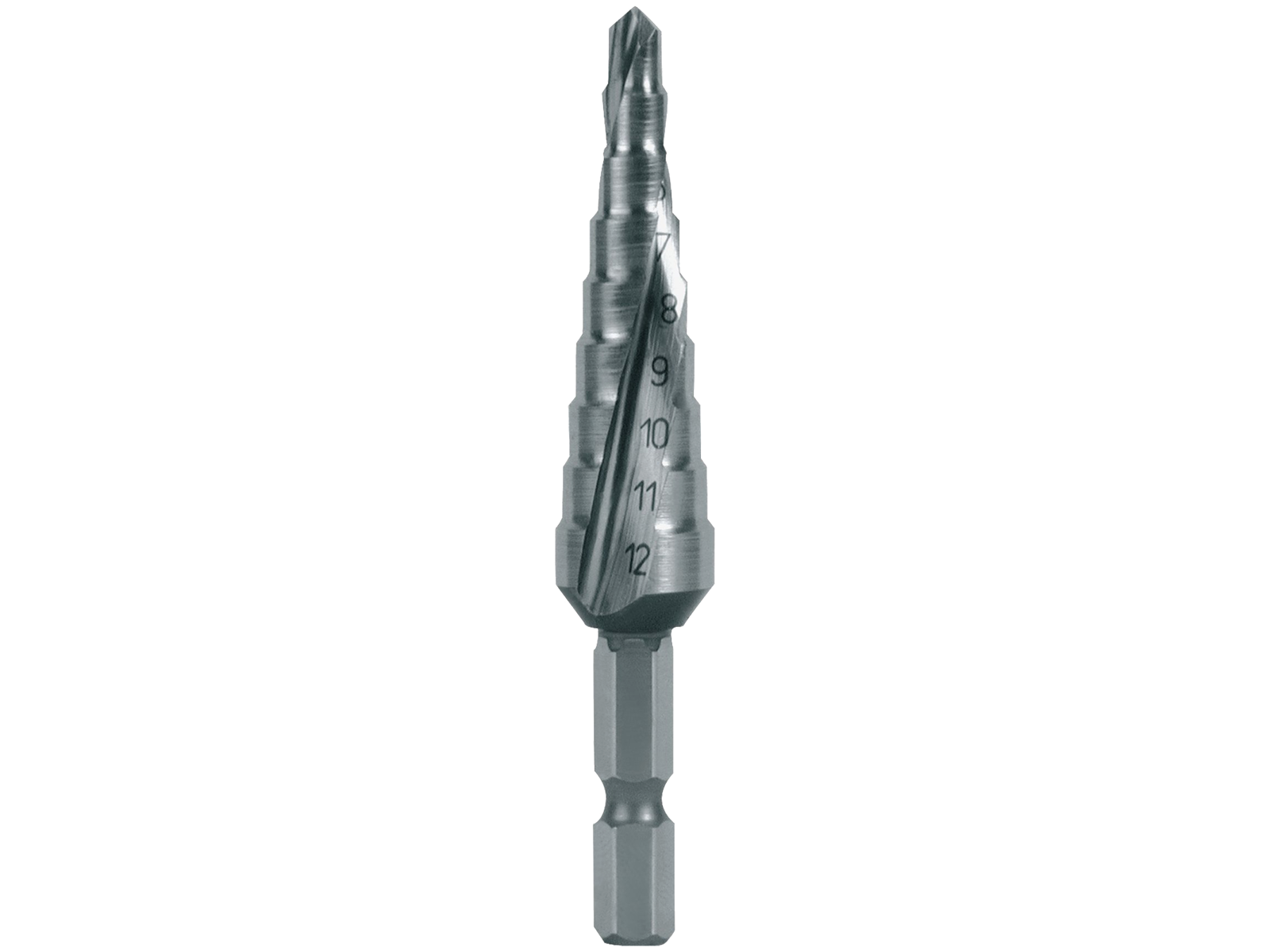 Trappebor HSS med 1/4" bit-skaft. Det perfekte værktøj til bearbejdning af tynde metalpalder op til 4 mm.