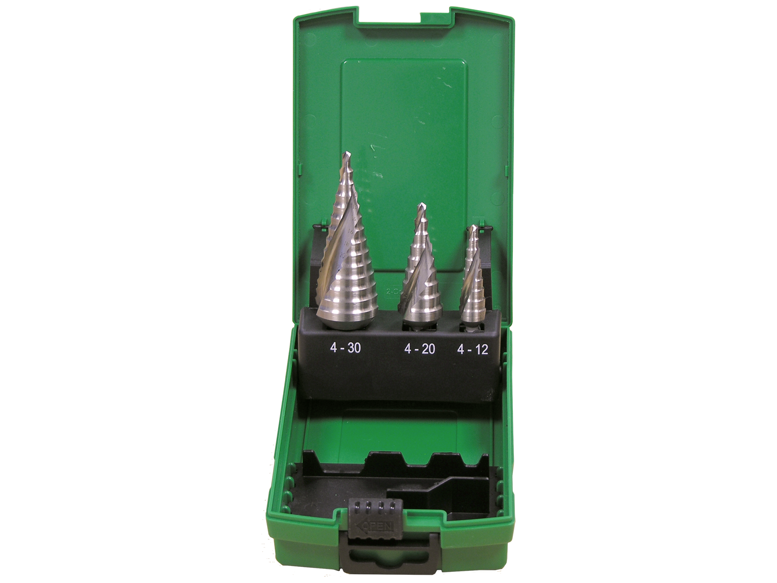 HSS trinborsæt med 3 dele: 4-12/4-20/4-30 mm. Dybslebet og spiralsnoet spånkanal, der giver roligt løb. Til stål, støbegods, NE- og letmetaller.