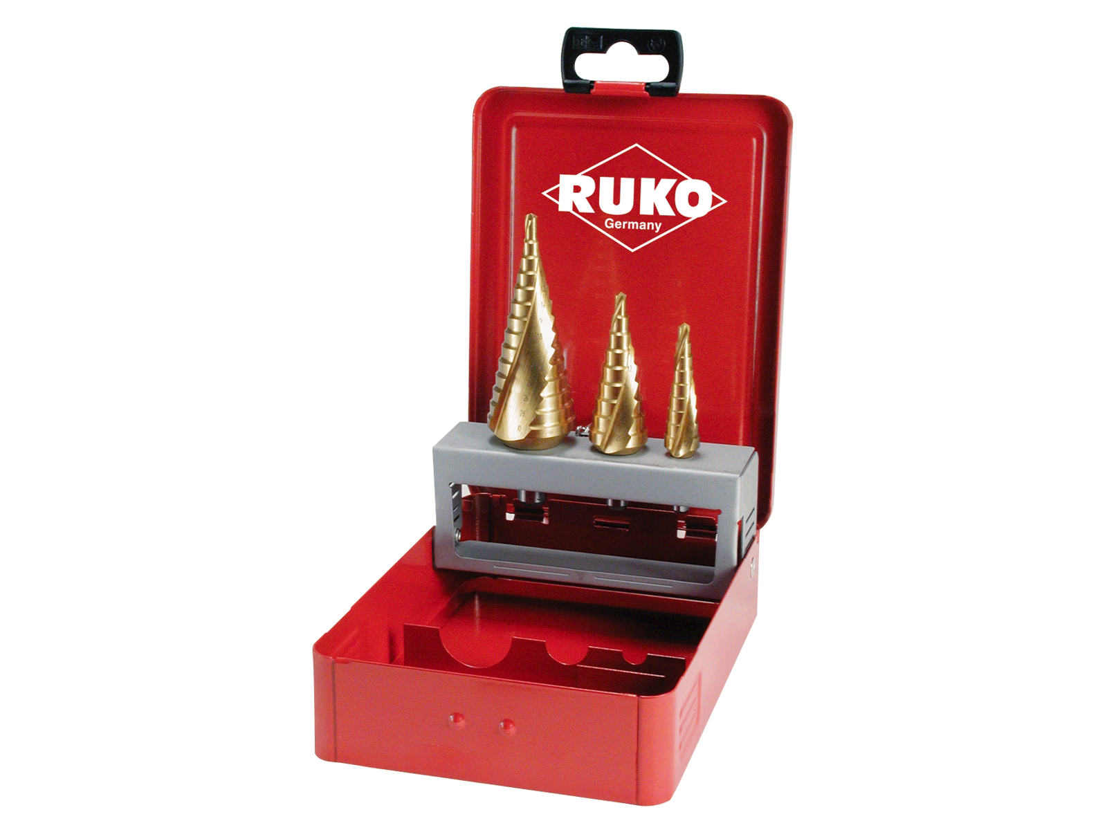Sæt med trappebor i stålkassette. Trappebor 4-12 mm. 4-6-8-10-12 mm. Trappebor 4-20 mm 4-6-8-10-12-14-16-18-20 mm. 4-30 mm. 4-6-8-10-12-14-16-18-20-22-24-26-28-30 mm. Den dybslebet og snoet spånkanal giver et helt roligt løb og stor skærekapacitet. Konus for enden af trappeboret letter tilbagetrækning ved gennemboring af materialet. Ideel til rustfrit stål. Pladeboret kan centrere, forbore og udbore i en arbejdsgang. Ved anvendelse af skærespray, pasta eller andet kølemiddel kan værktøjets levetid forlænges betydeligt. Vælg mellem Co-5, TiN eller TiAIN.