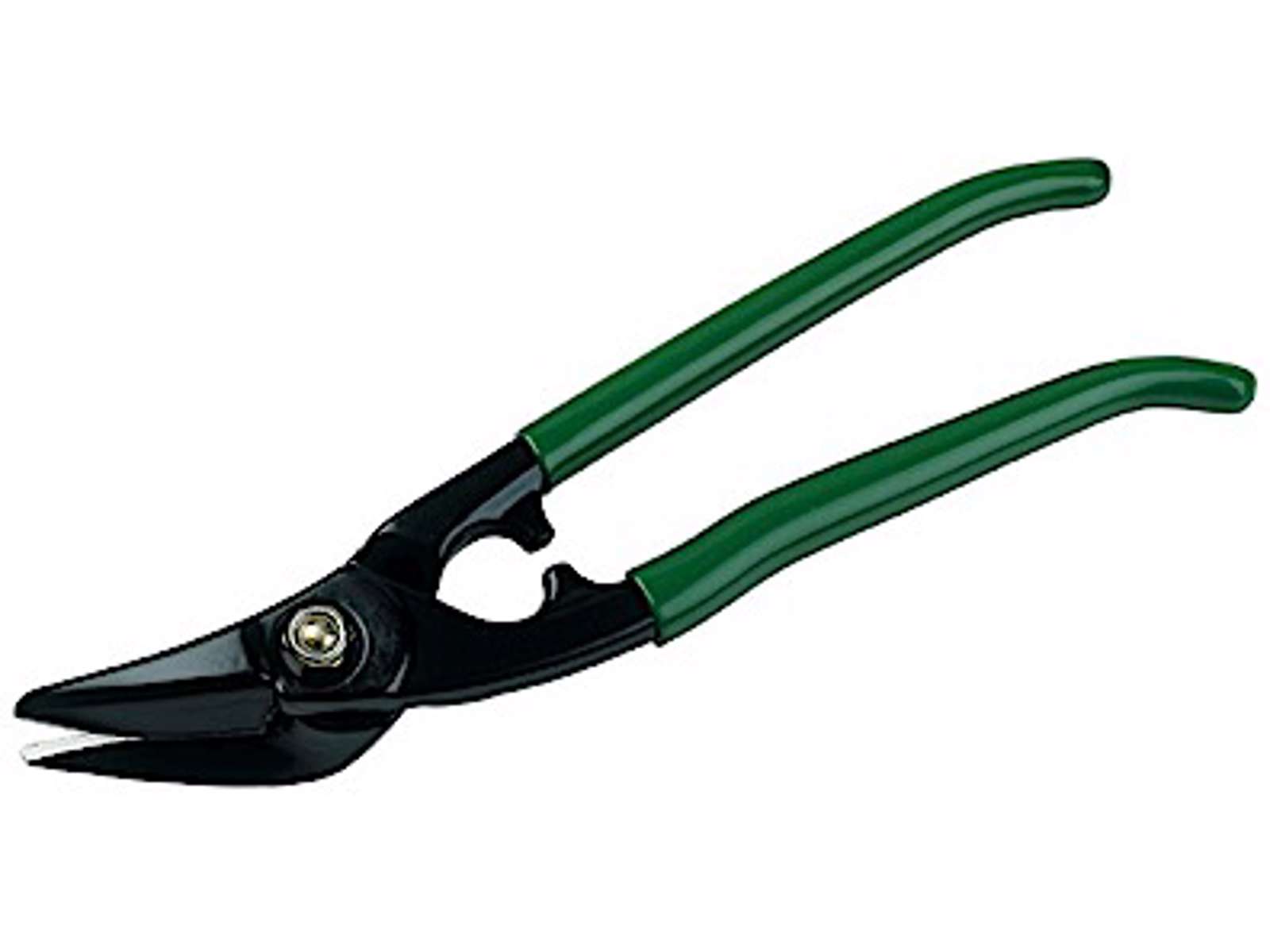 Induktionshærdede skær med en hårdhed på 59 HRC. Særlig velegnet til klipning af huller og små kurver. Øverste skær er let riflet, så saksen ikke glider ved klipning af slidser og trimmeopgaver. For lige- og højreklip i normale pladetyper. Plastdyppede håndtag.