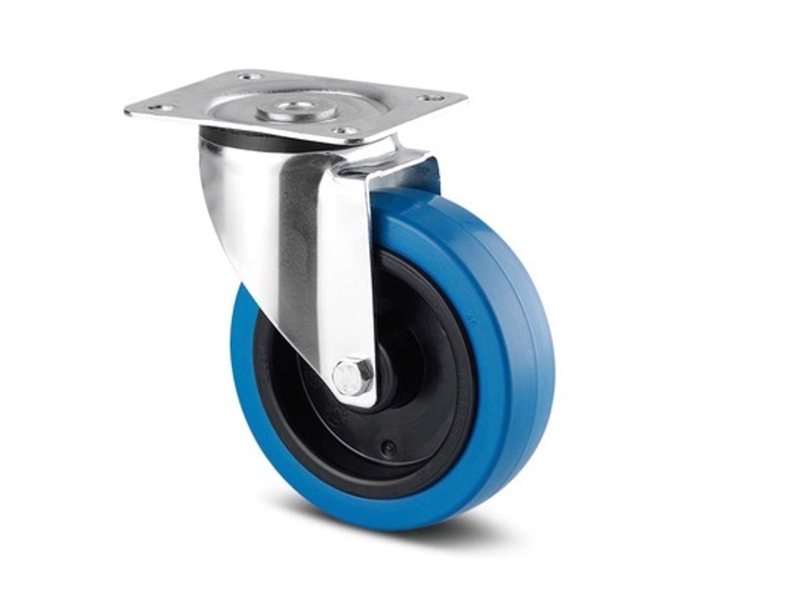 Drejeligt hjul, 100 mm. Transport, belastning 160 kg. Nav i polyamid med blå elastisk gummibane. Rulleleje