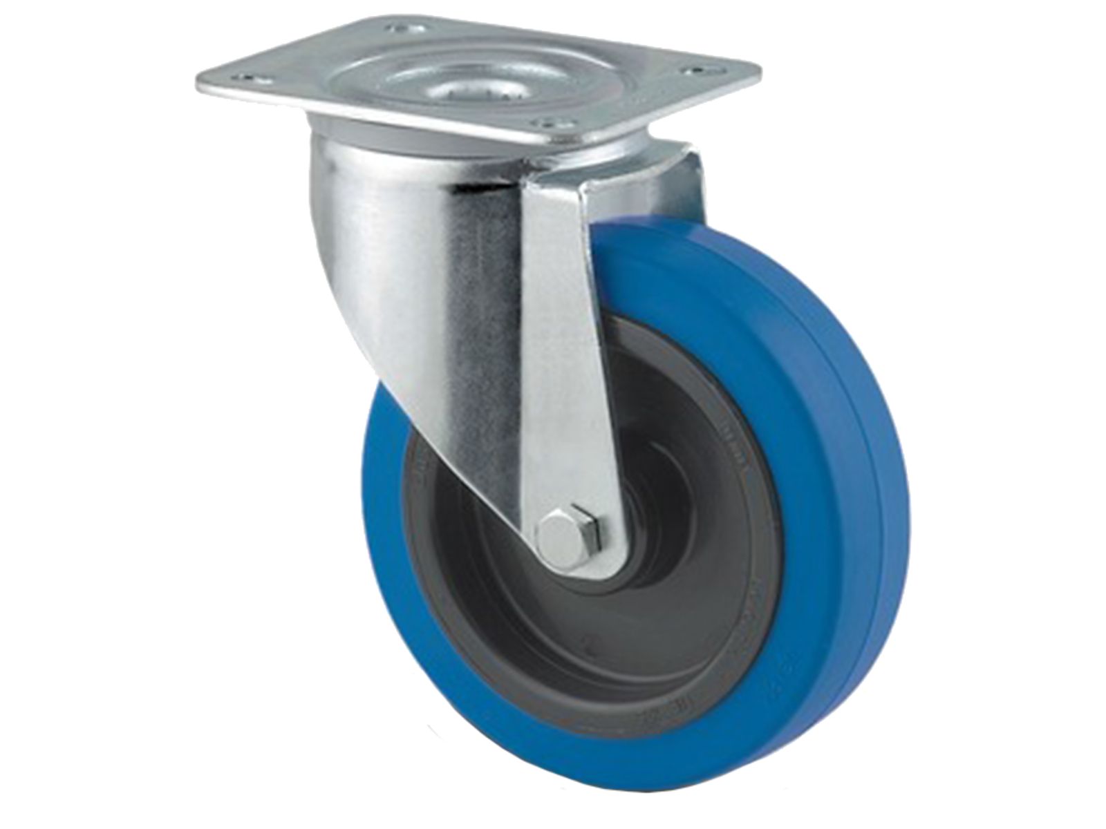 Drejeligt dobbelthjul med gaffel i svær stålplade med bred gaffelform og dobbelt kuglekrans. Nav i polyamide med blå elastisk gummibane og rulleleje. Med plade. Fås i flere dimensioner.