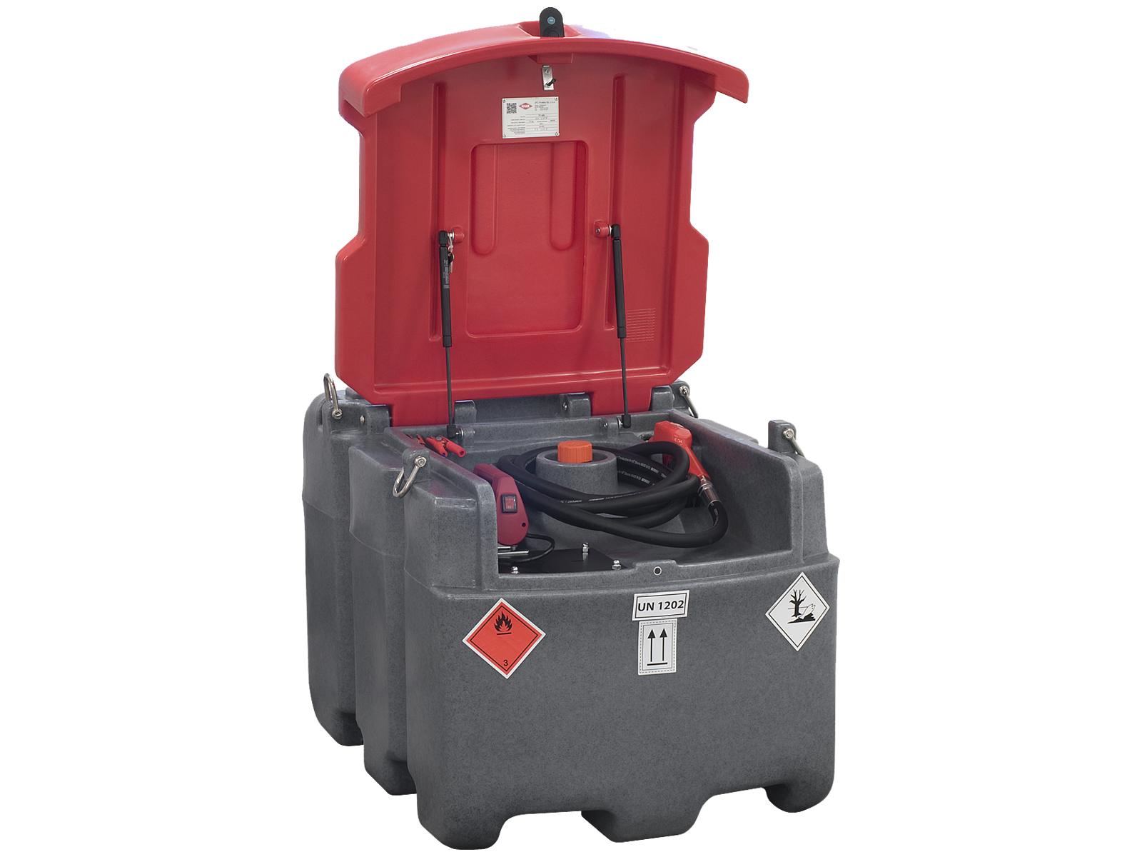 Tanken er fremstillet af UV-stabiliseret MD-polyethylen. Indvendige finner beskytter mod for stor bevægelse af brændstoffet under transport. 2 gasfjedre holder låget når det er åbent, og den indbyggede lås sikrer distributionssystemet mod uautoriseret adgang. Tankens unikke udformning giver adgang med palleløfter fra alle sider. Den er desuden udstyret med 4 sjækler i rustfri stål til løftning. Pumpe: 12V DC, 40 l/min. Selvansugende med by-pass. Drifttid max. 30 min. 4 mtr. el-kabel med krokodillenæb.