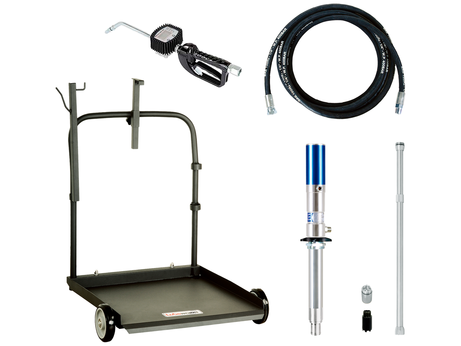 • Effektivt og slidstærkt komplet oliesæt til professionelle miljøer, hvor driftssikkerhed, fleksibilitet og brugervenlighed er i fokus. Sættet består af: Manuel tromlevogn til sikker transport af 180-220 ltr. tønder (maks. 220 kg), digital oliepistol (35 ltr.) med LCD-display og slagfast beskyttelse, dobbeltvirkende pumpe med tromleadapter (60-208 ltr.), samt 4 mtr. 1/2" olieslange.