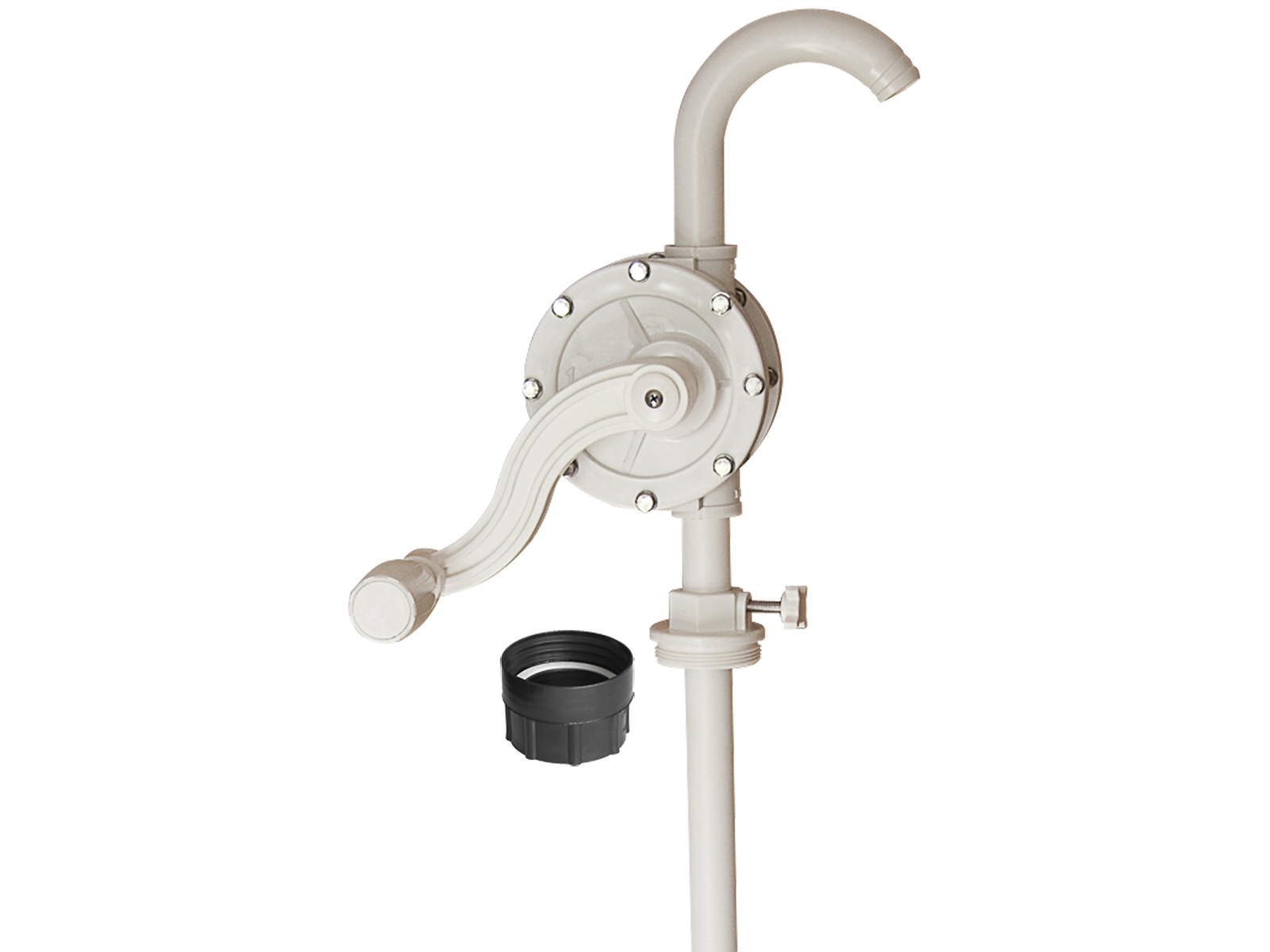 Rotationspumpe af PVC inkl. adapter 2"R (indv..) - DIN 71 (indv..). Pakning af teflon (PTFE). 3-delt sugerør som passer til 50-205 ltr. Giver ca. 0,3 ltr. pr. omgang. Velegnet til: Kølervæske, sprinklervæske og rengøringsmidler.